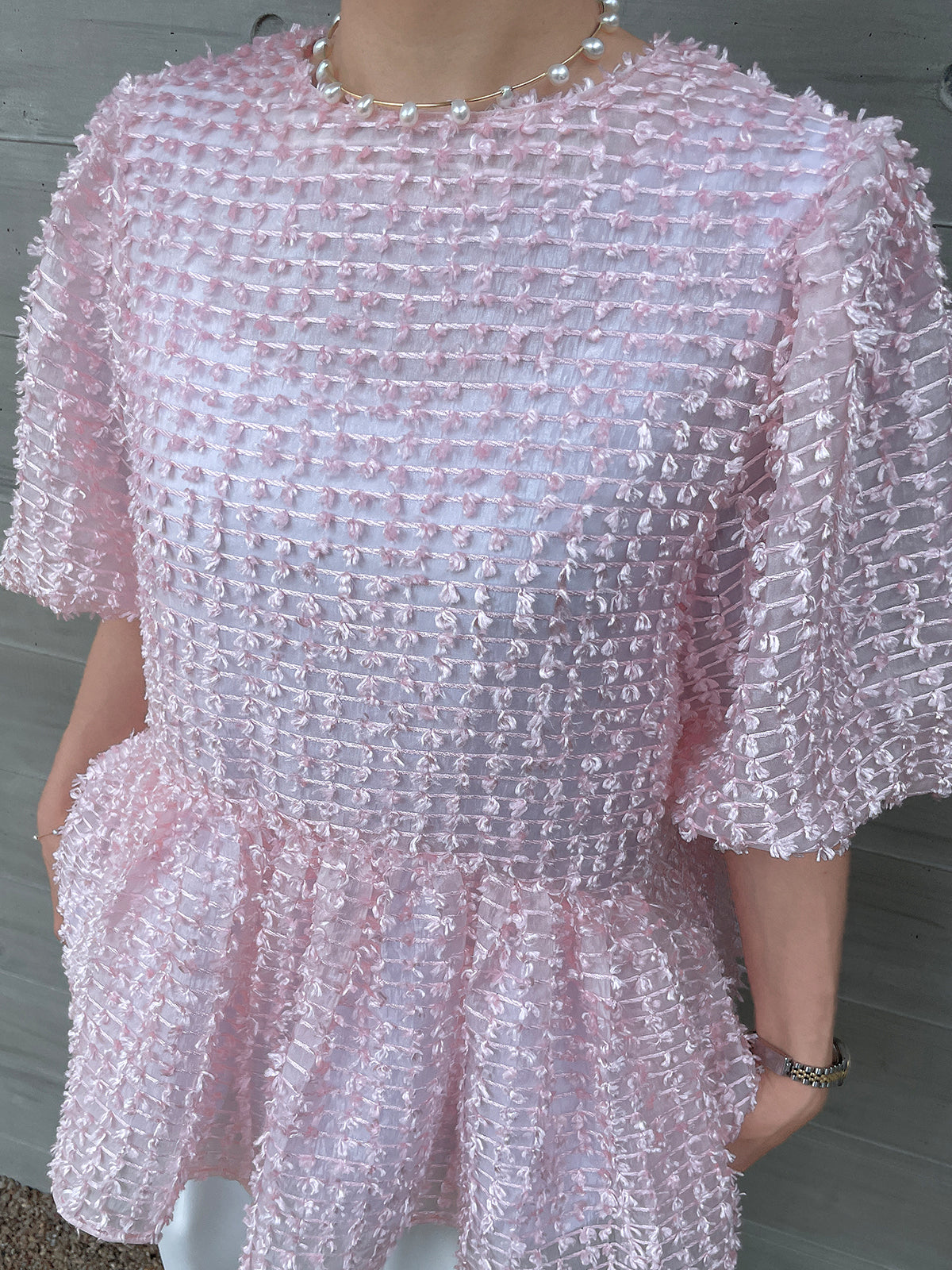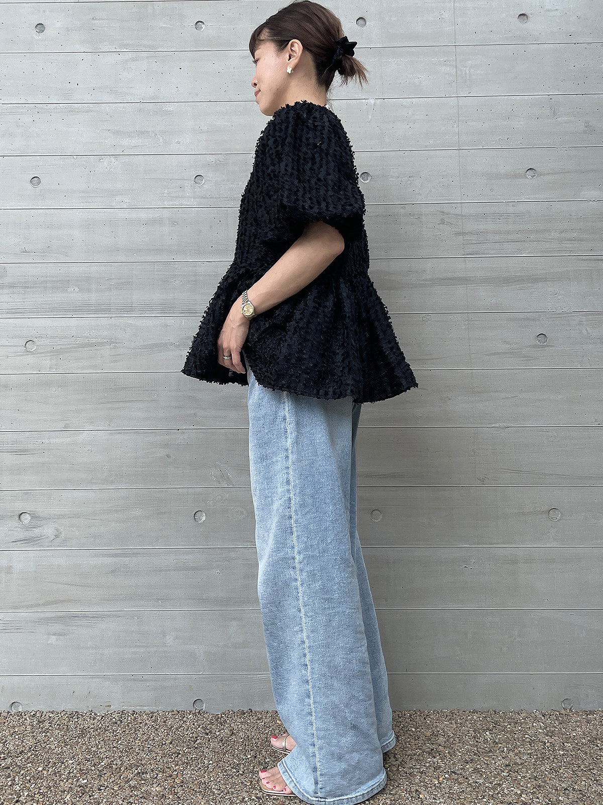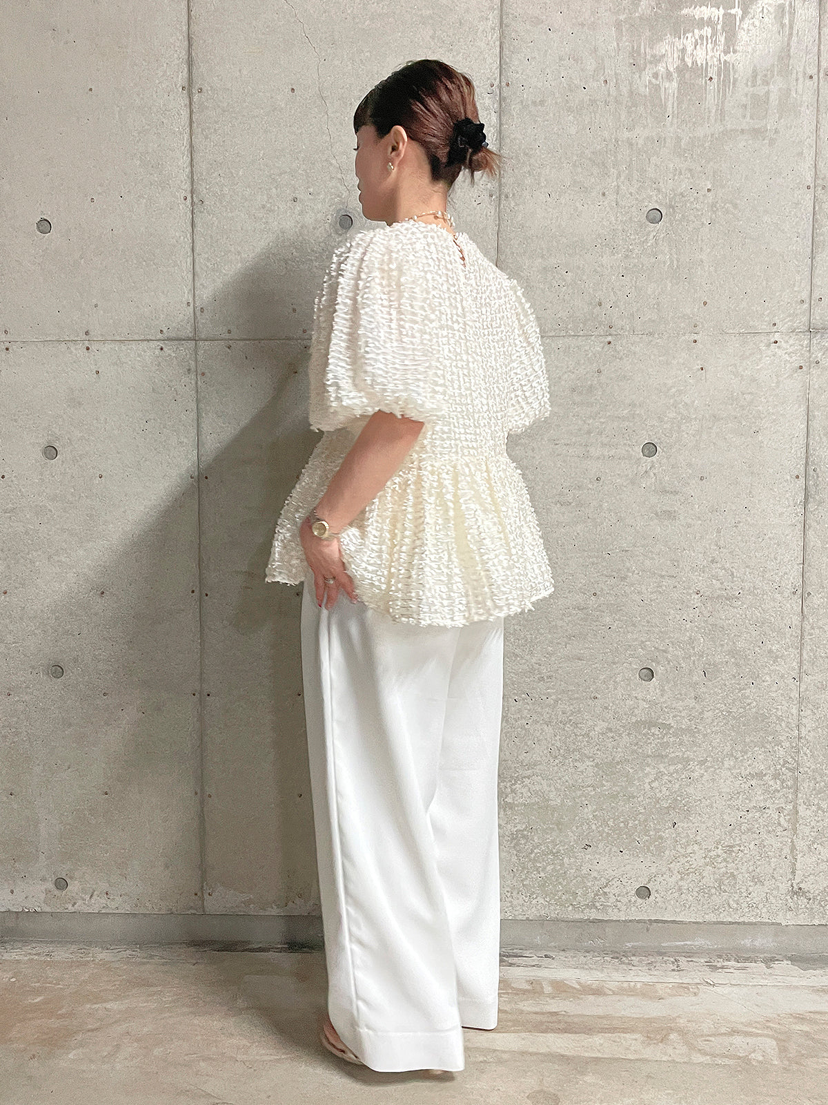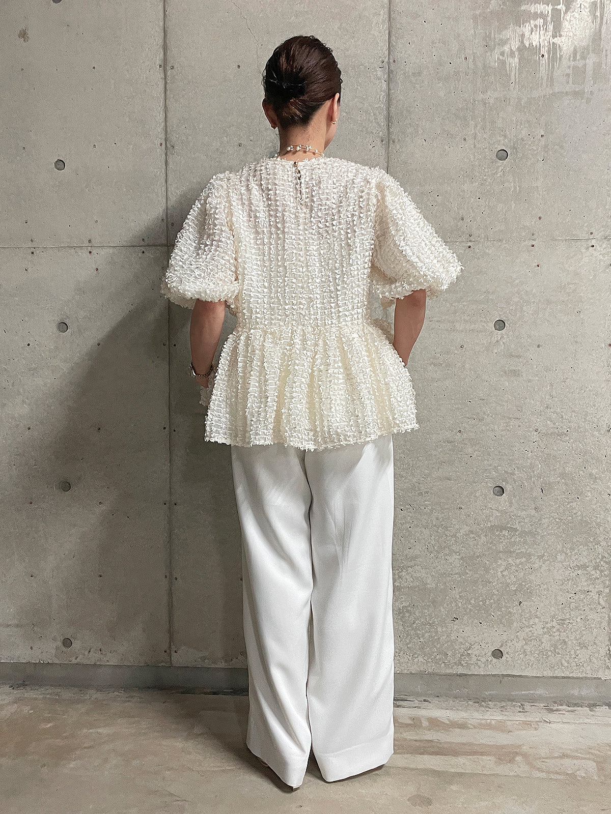 ウエストラインにはギャザーをたっぷりと寄せて、自然なふくらみを持たせたペプラムシルエットに。