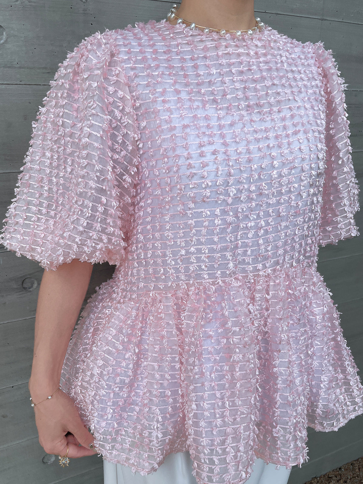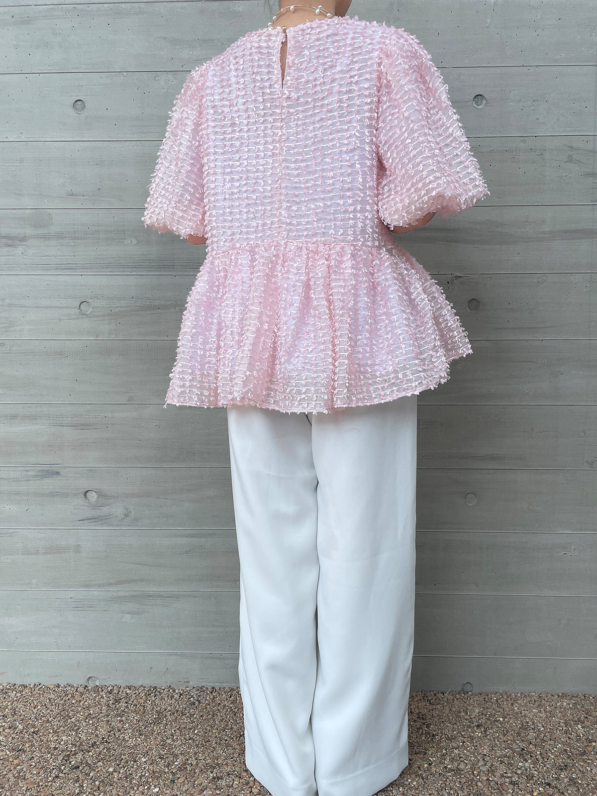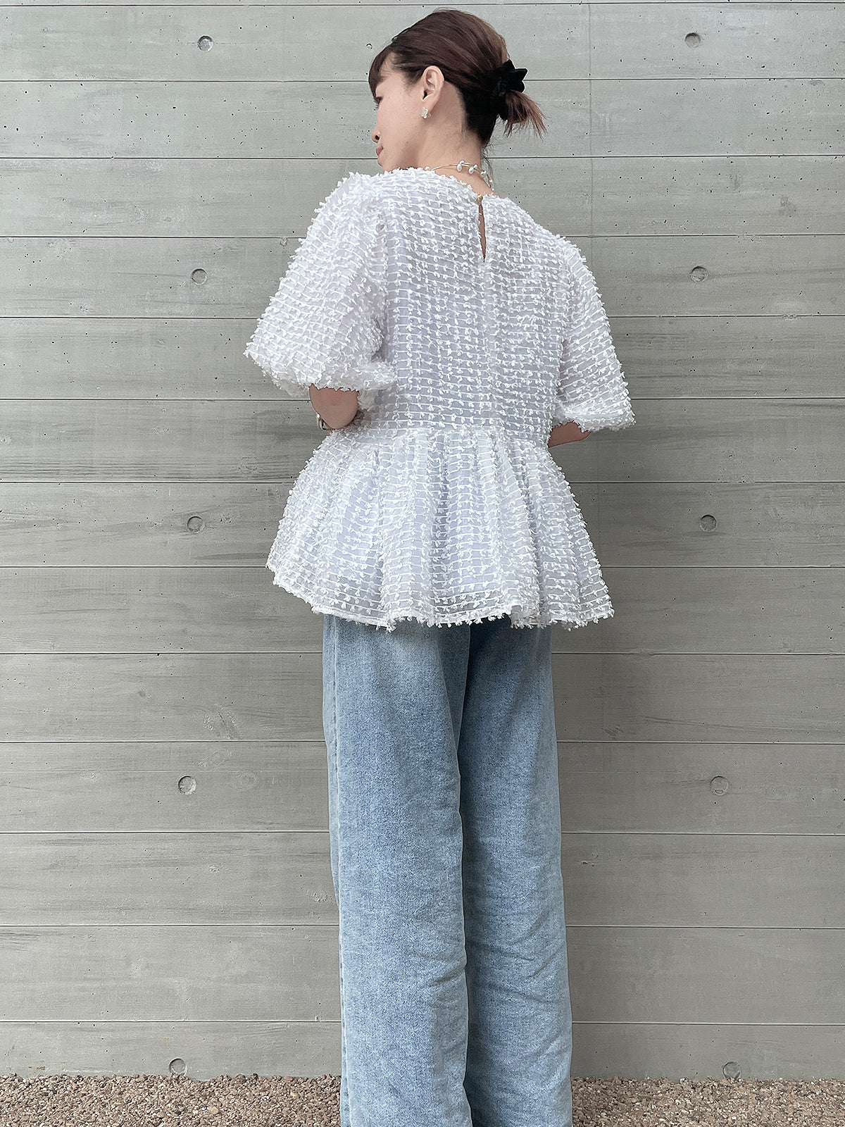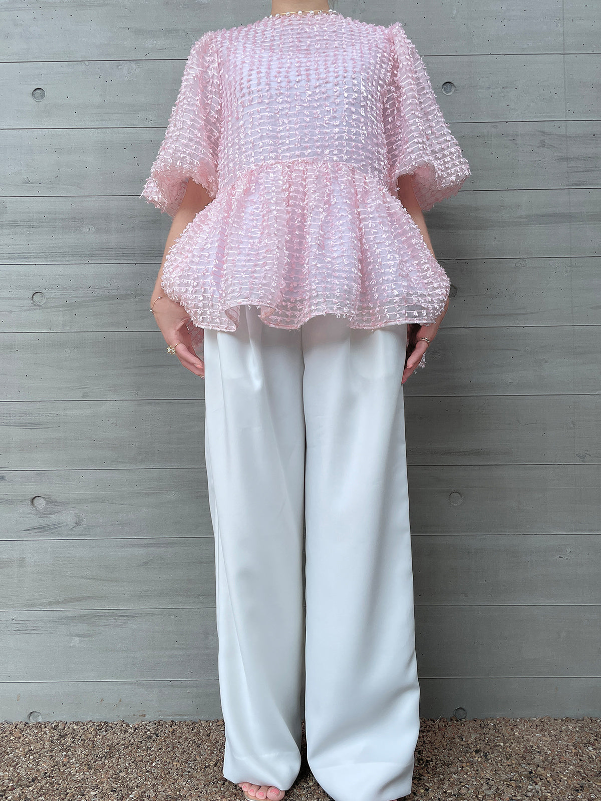 ウエストラインにはギャザーをたっぷりと寄せて、自然なふくらみを持たせたペプラムシルエットに。