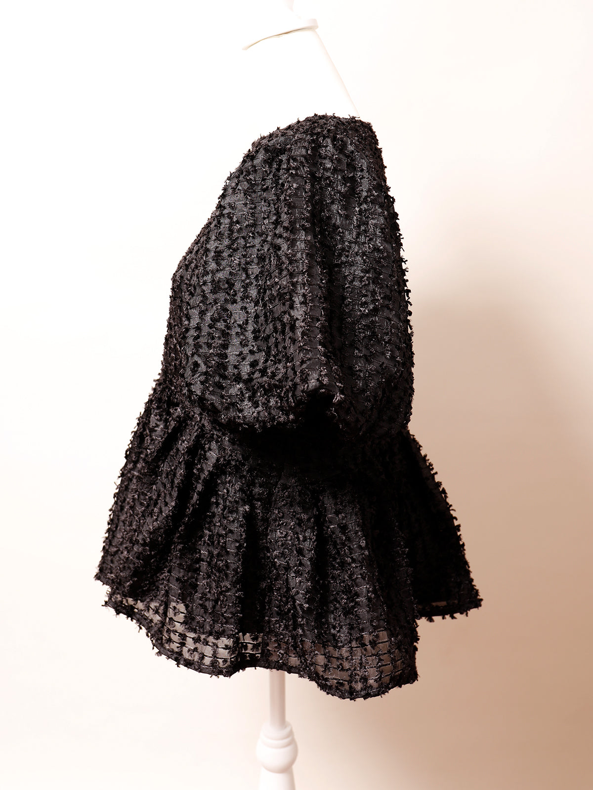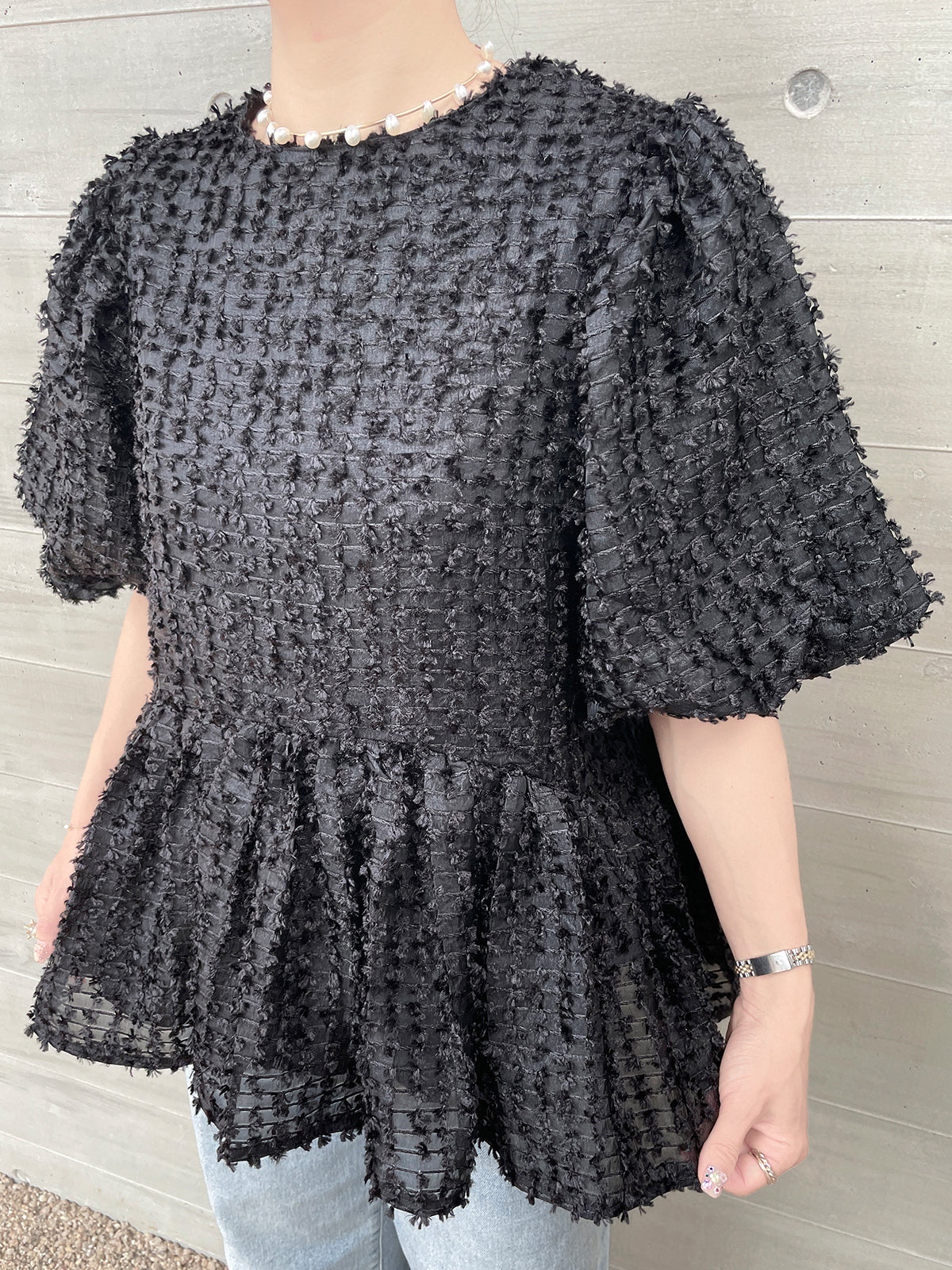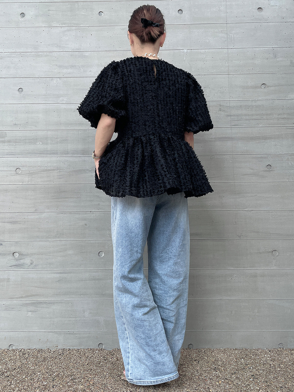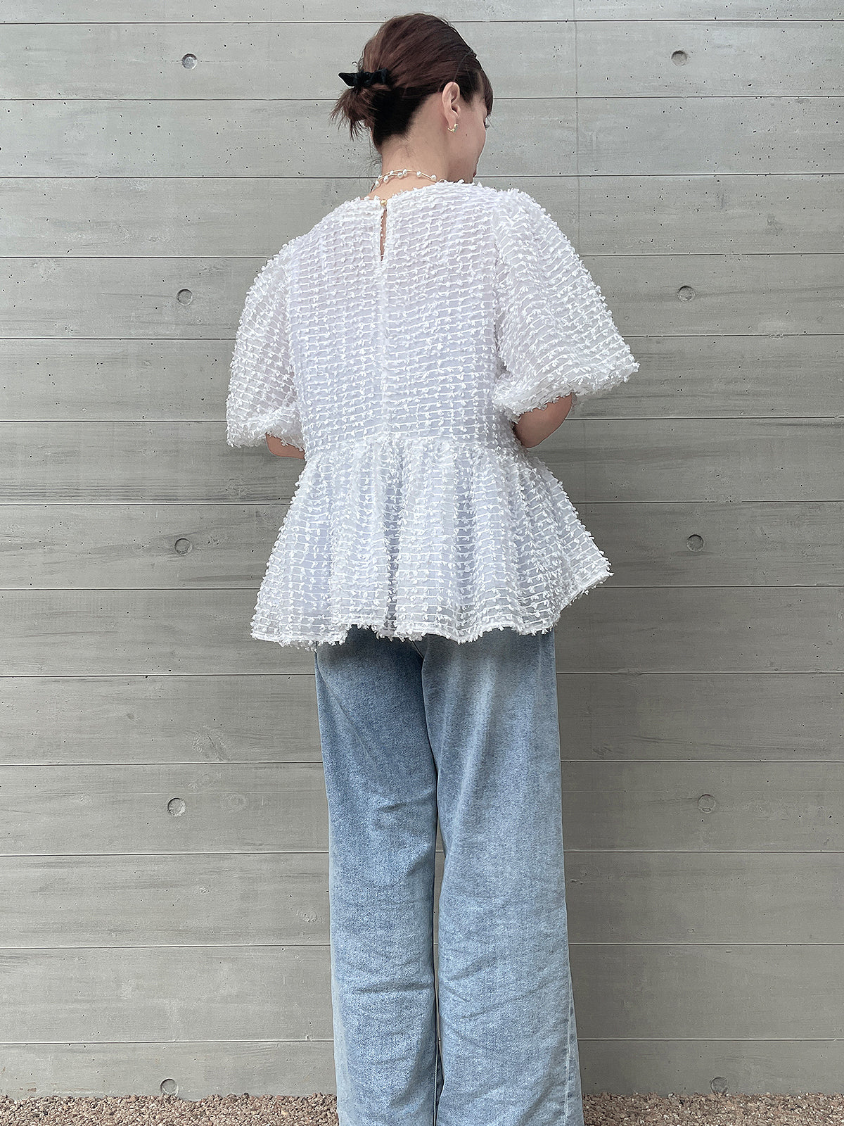 ウエストラインにはギャザーをたっぷりと寄せて、自然なふくらみを持たせたペプラムシルエットに。