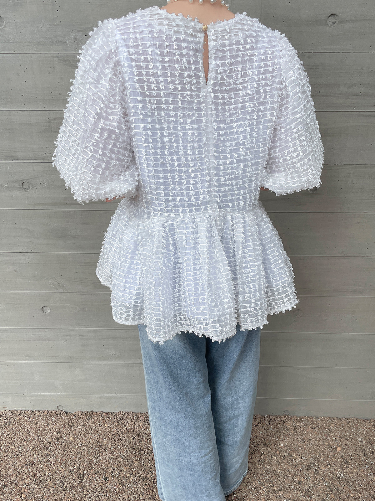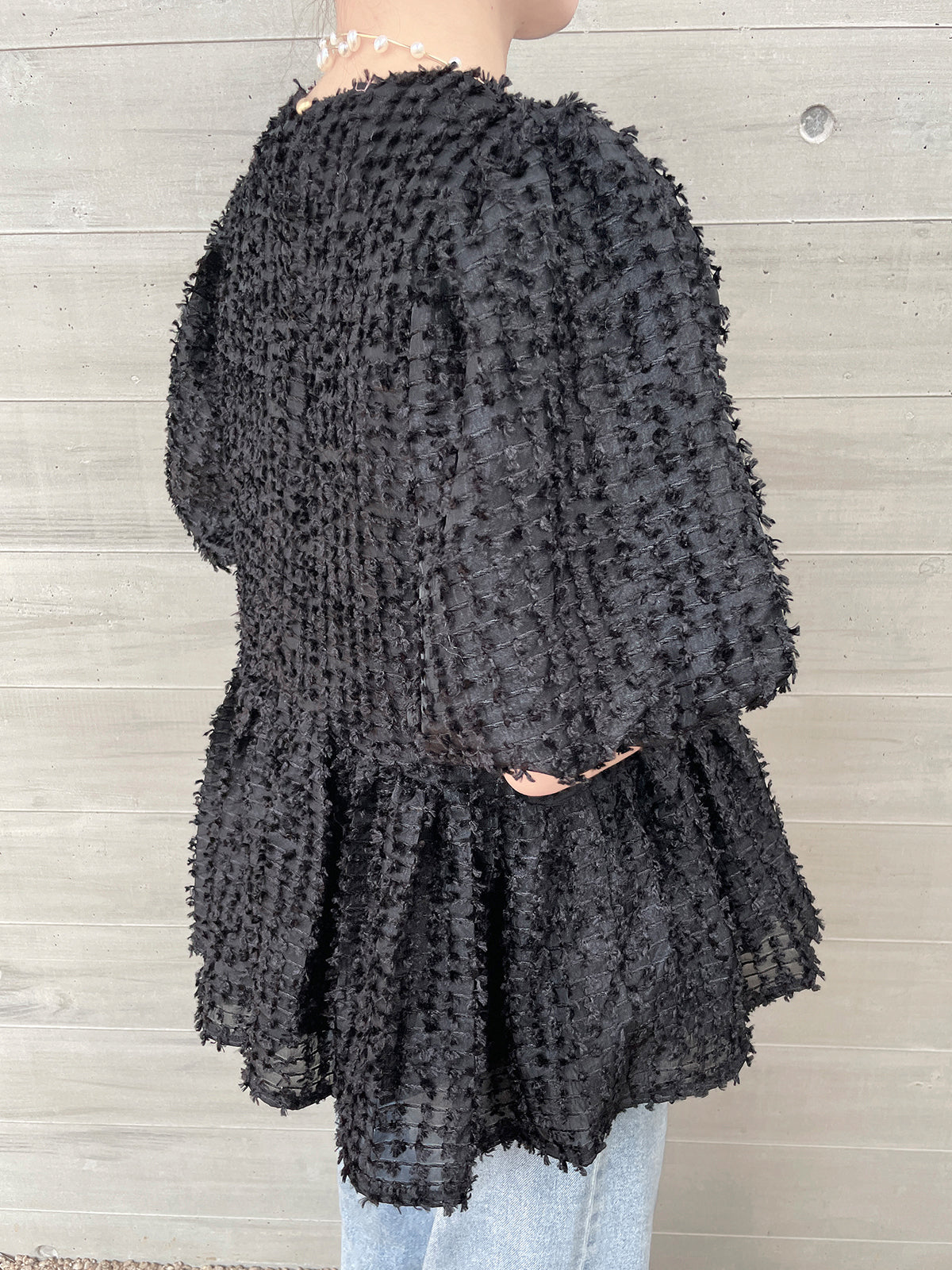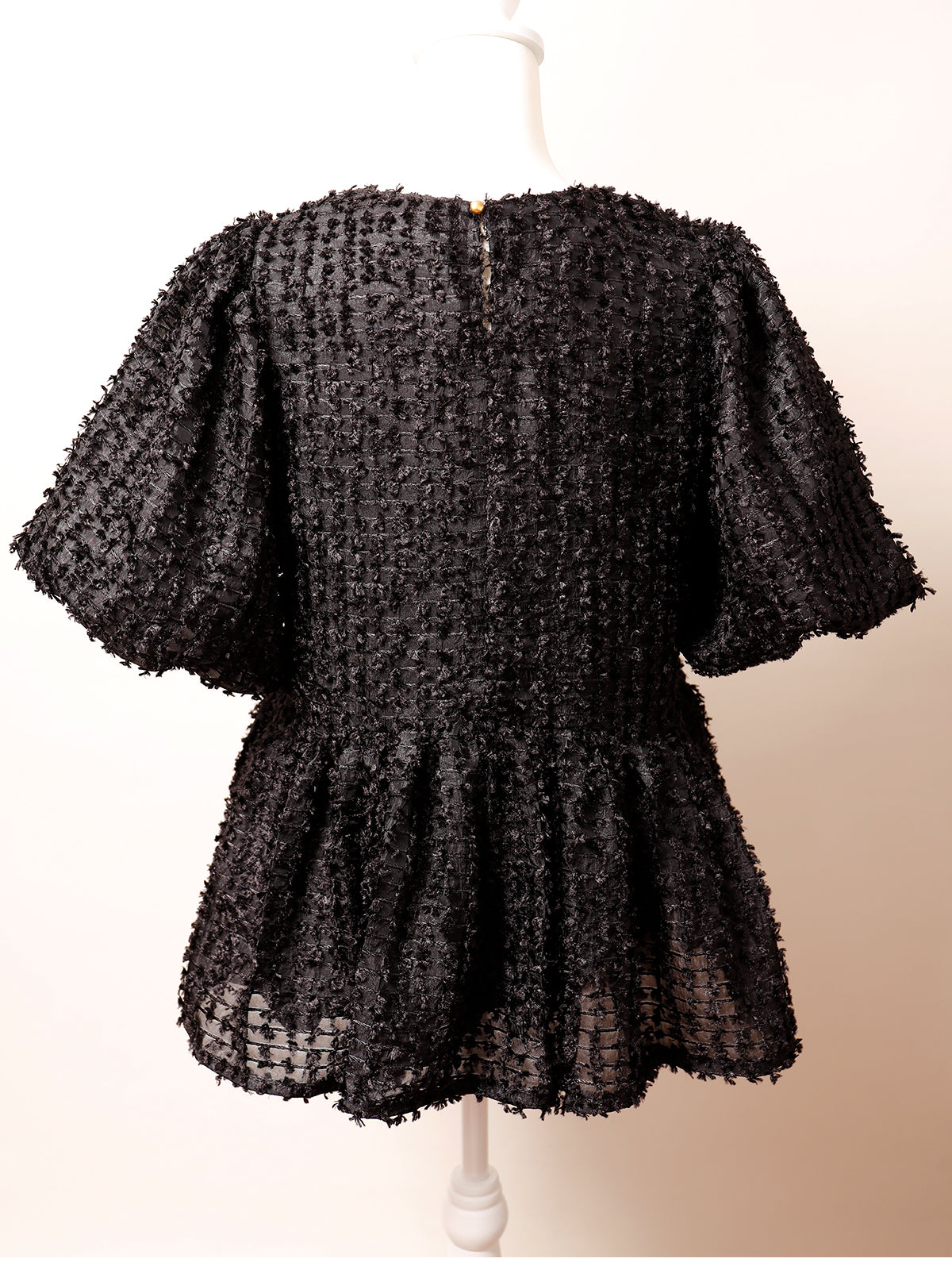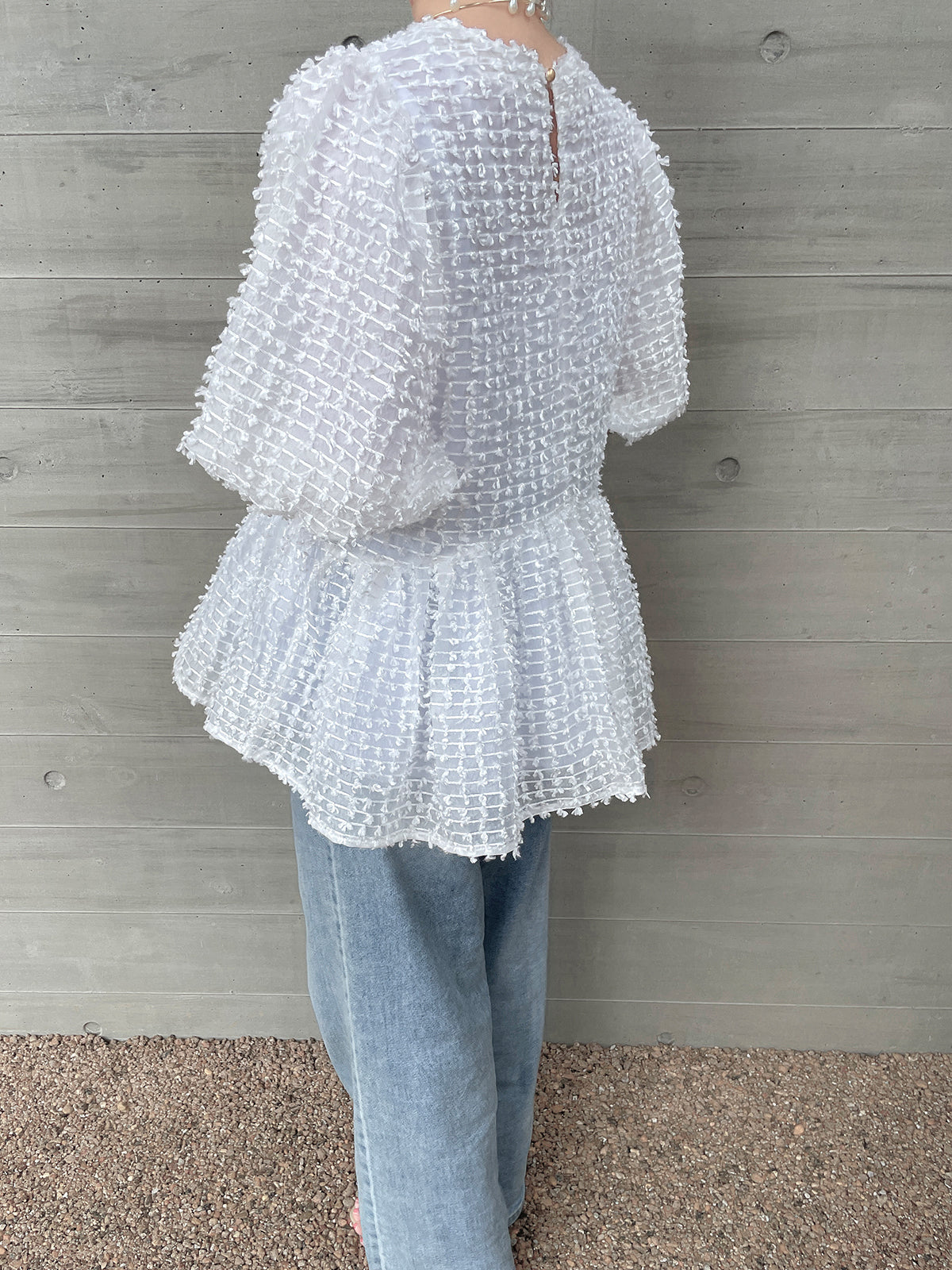 ウエストラインにはギャザーをたっぷりと寄せて、自然なふくらみを持たせたペプラムシルエットに。