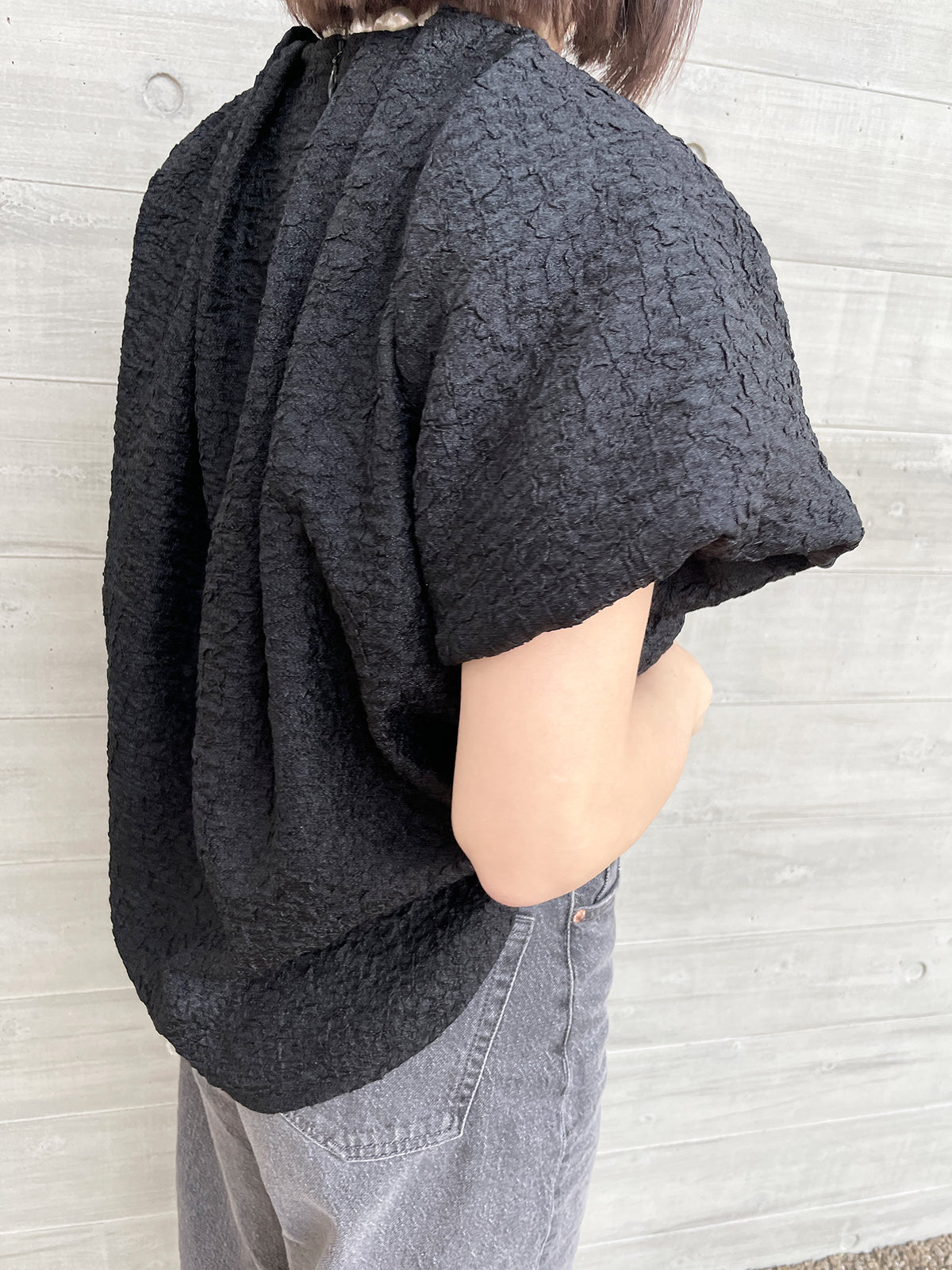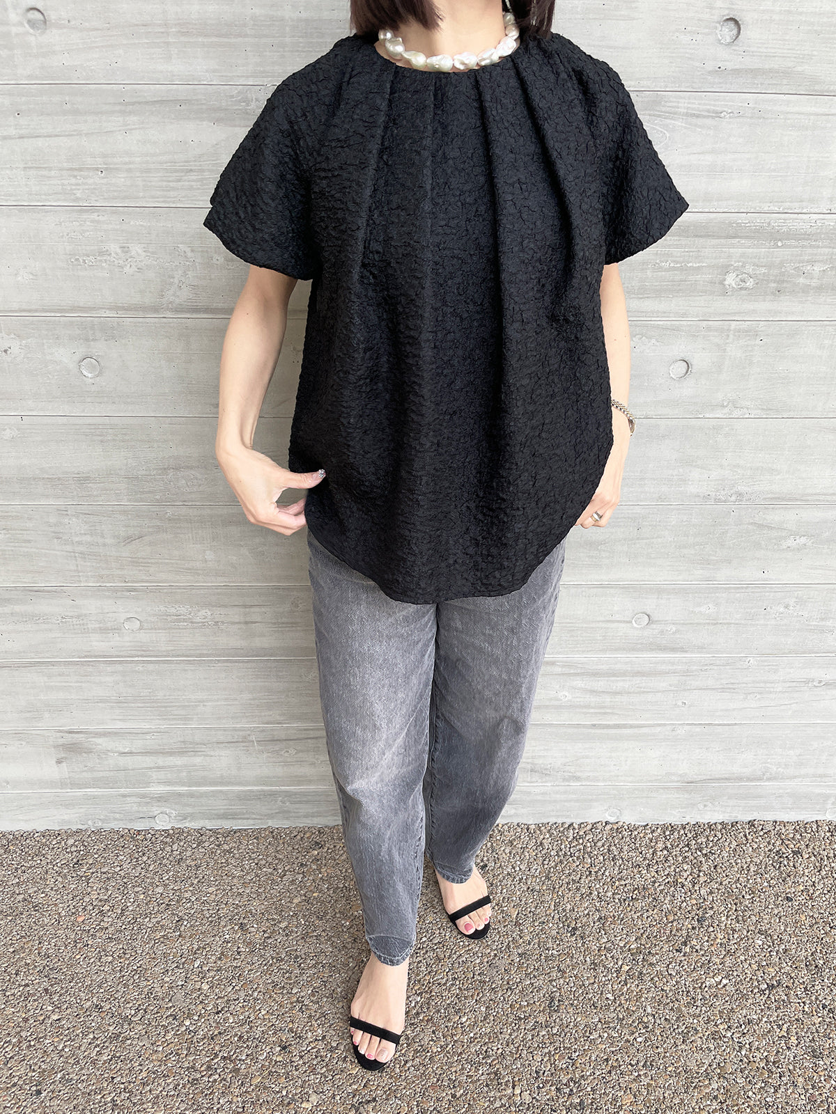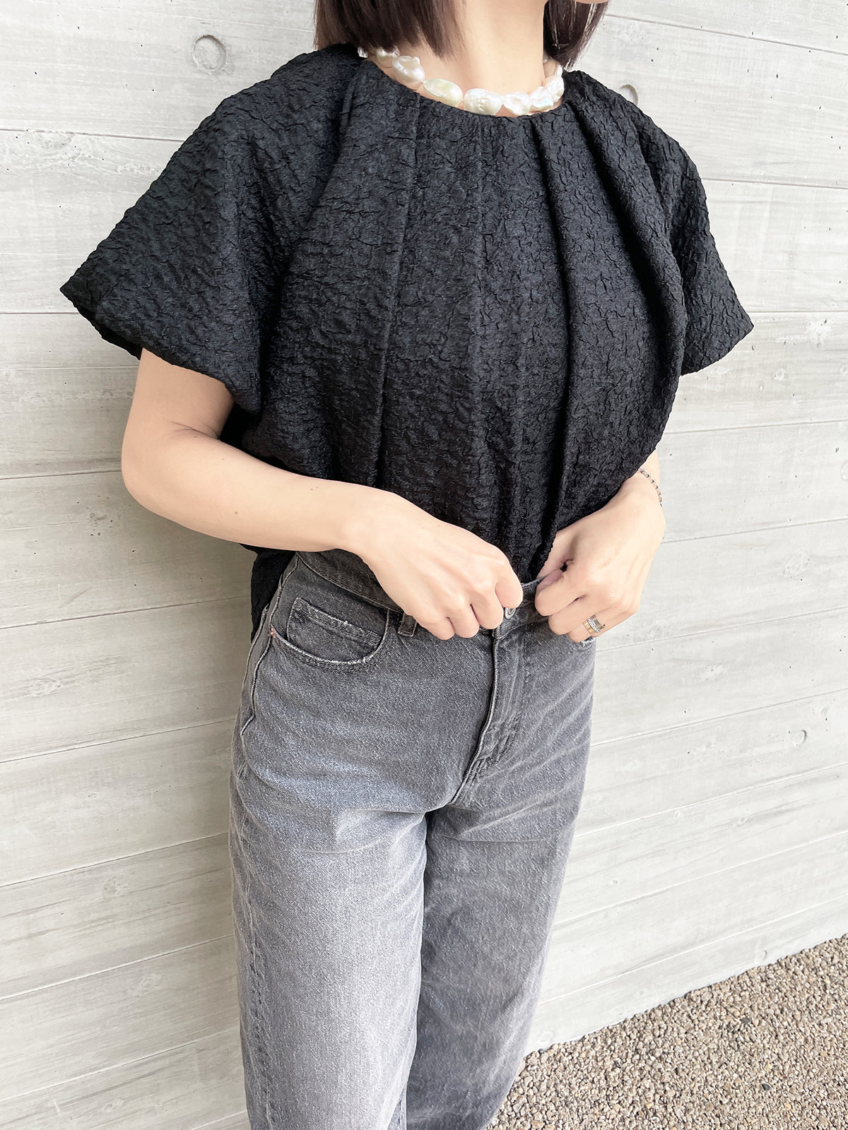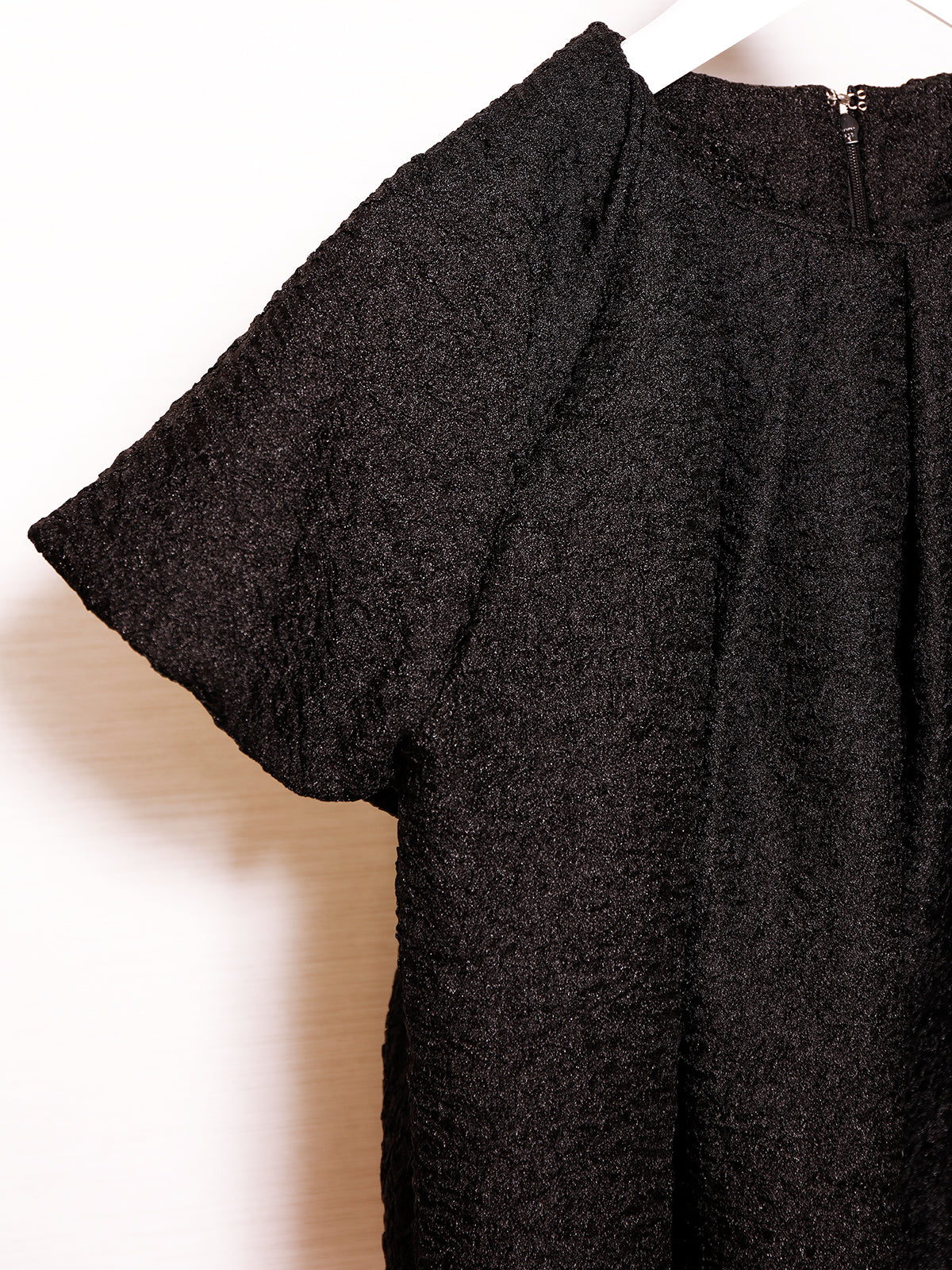 This jacquard top is made of fabric with a slightly shimmery, glittery feel and is attractive for its volume and lightness.