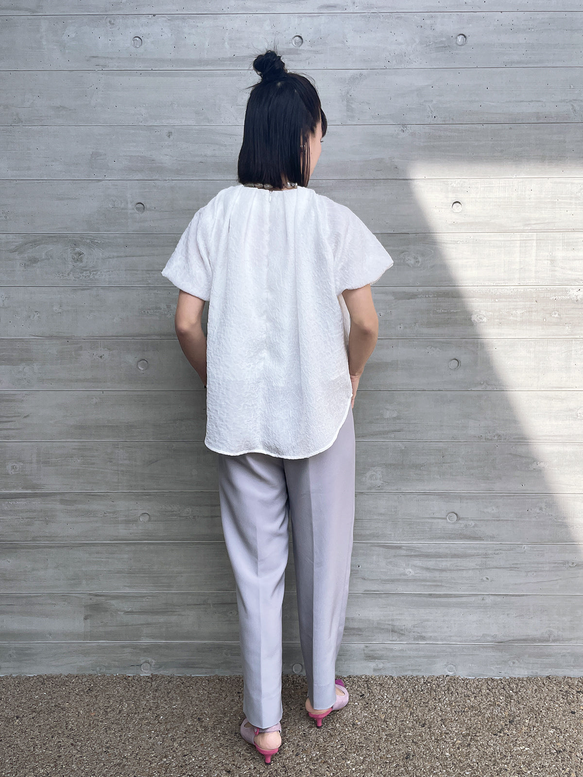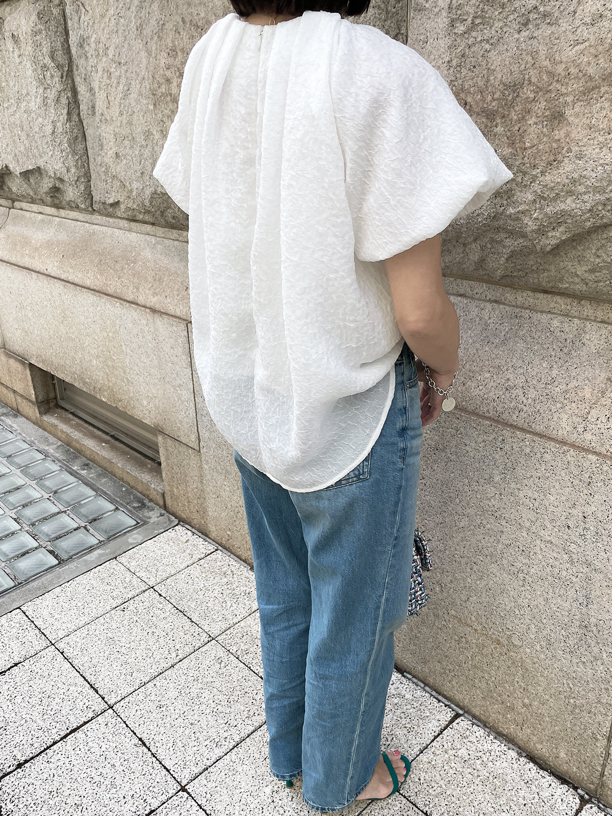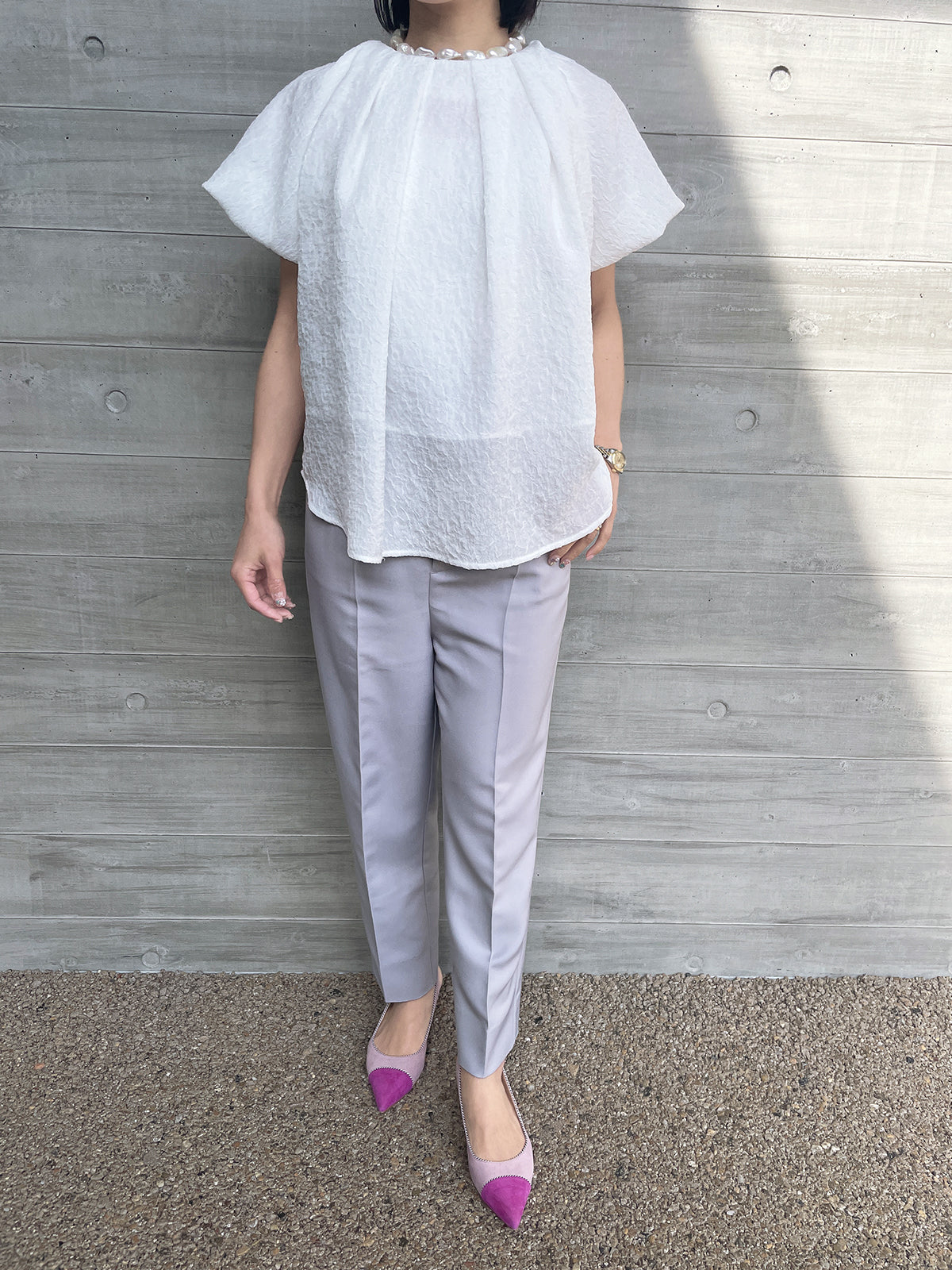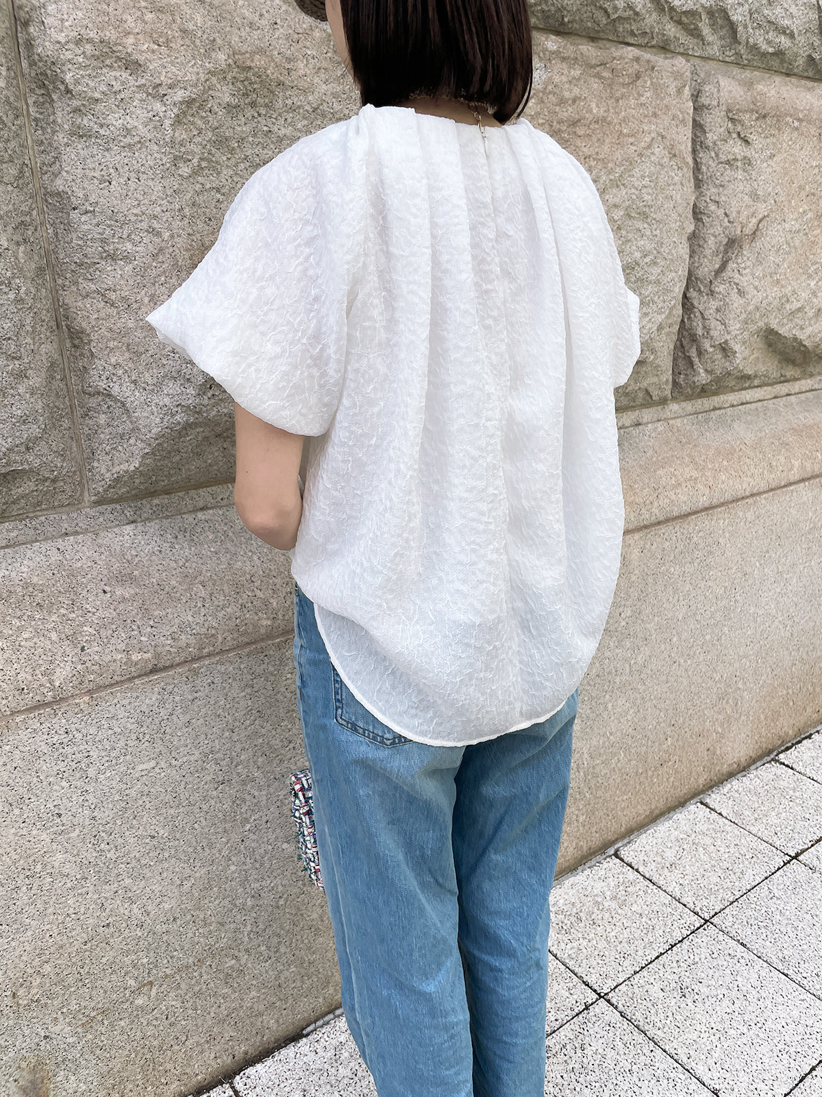 The sleeve length that falls slightly on the upper arms makes the arms look slender while giving a cool impression. It is a gorgeous blouse that can be worn with a wide range of scenes, such as with a casual bottom such as denim, as well as with a beautiful bottom, such as a meal or an occasion.