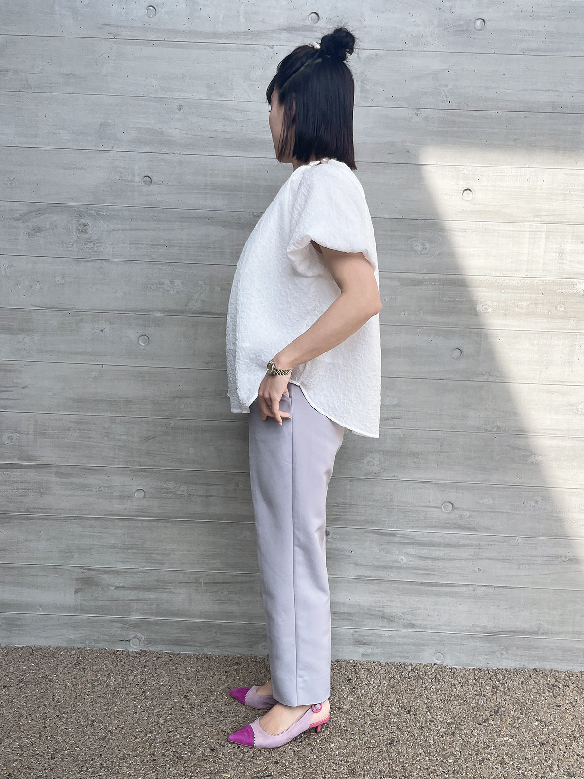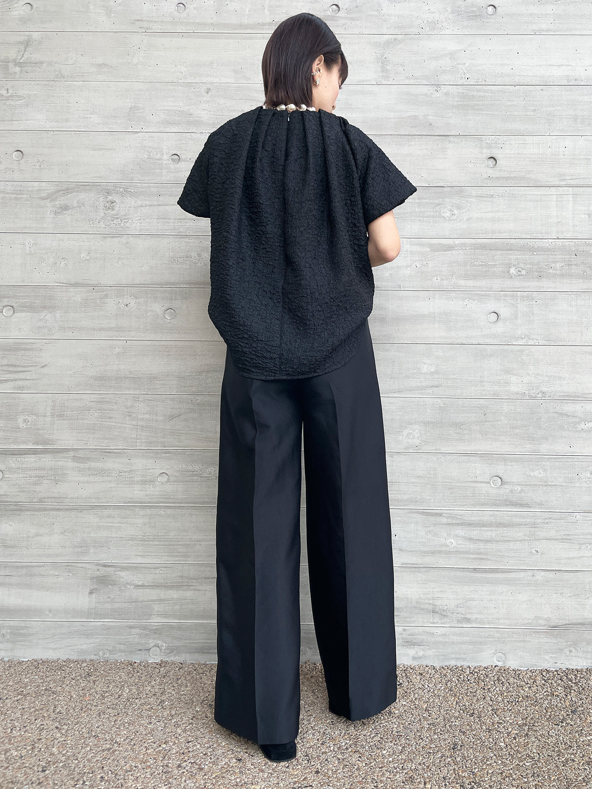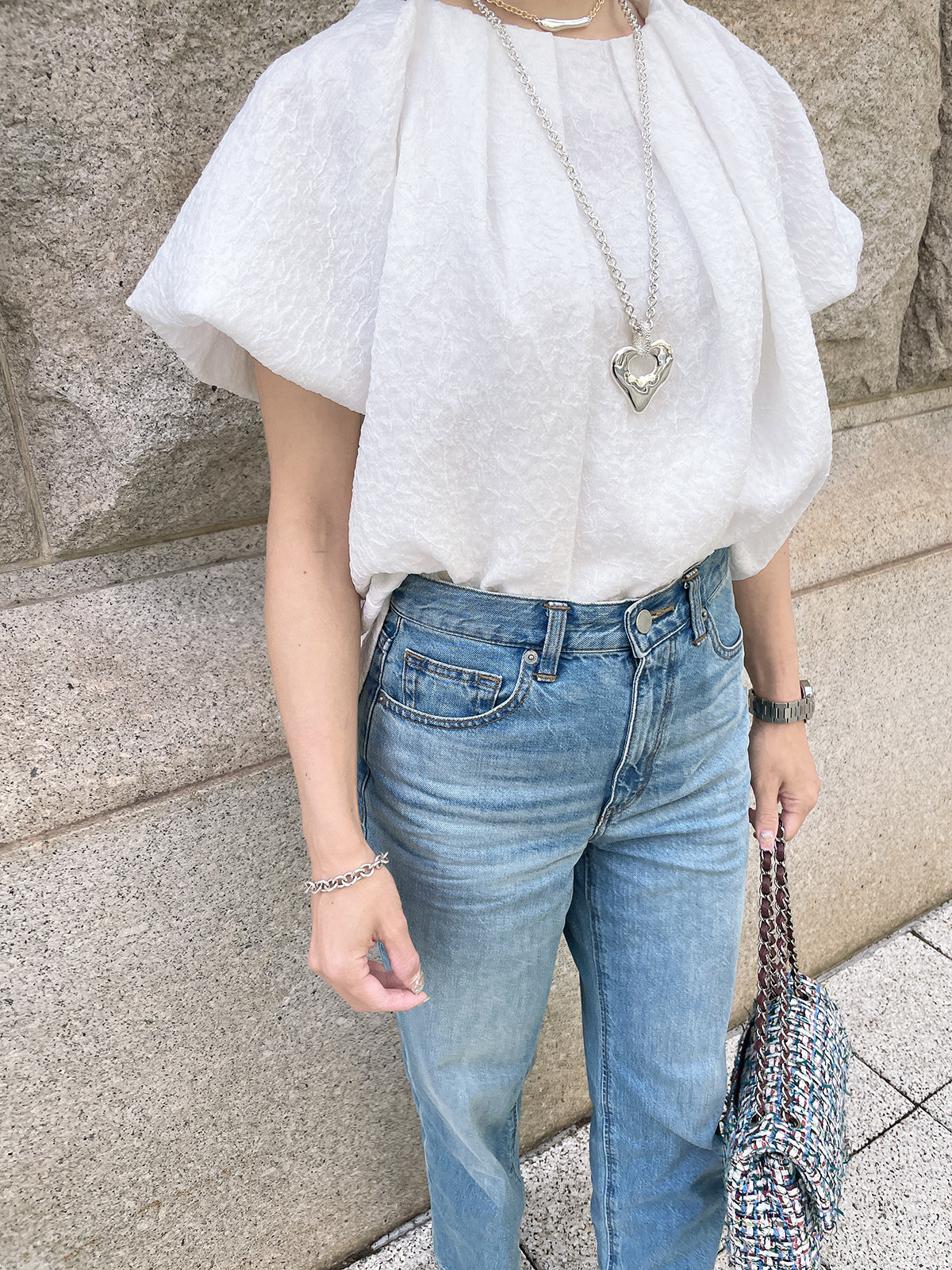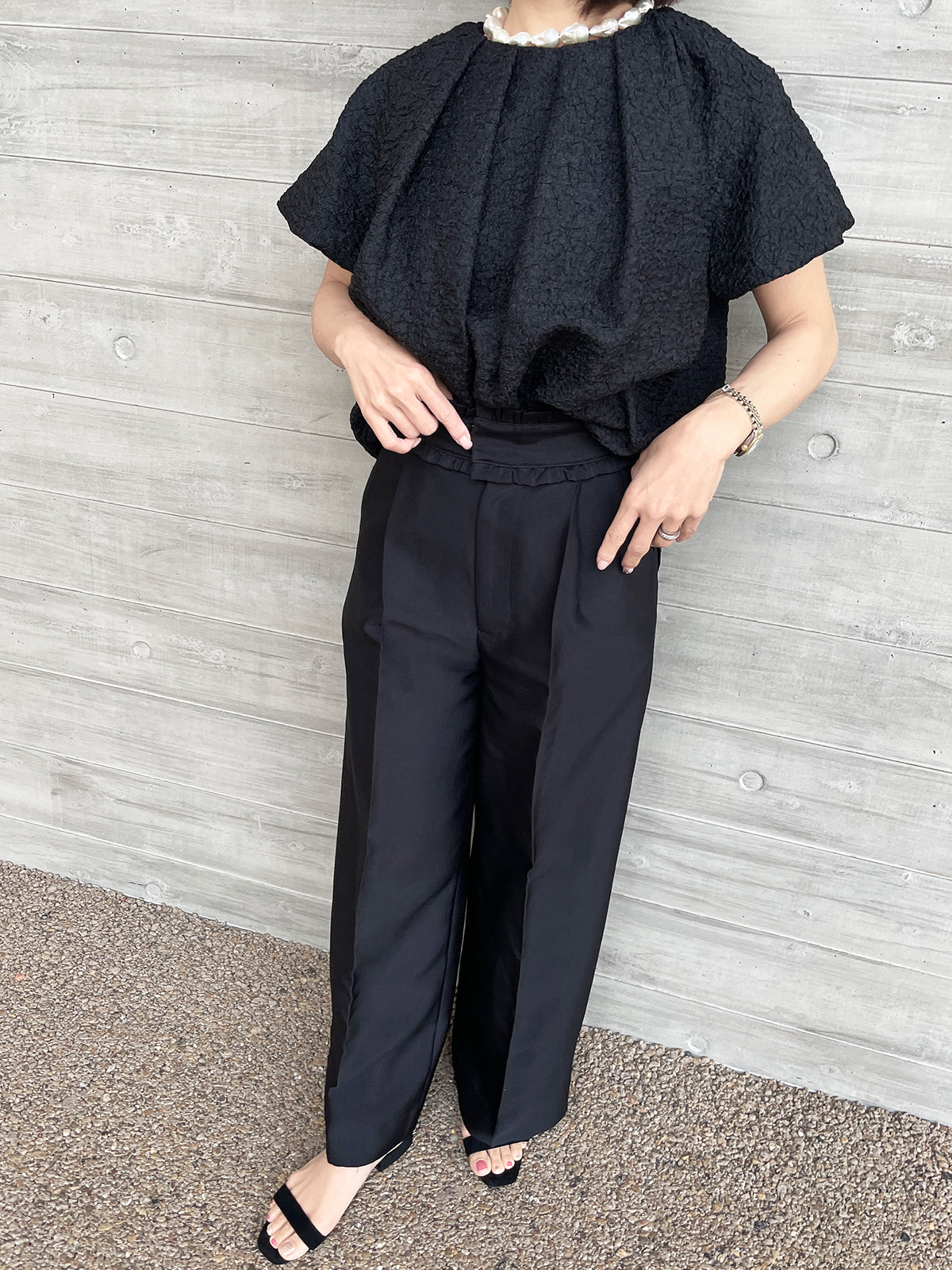 The sleeve length that falls slightly on the upper arms makes the arms look slender while giving a cool impression. It is a gorgeous blouse that can be worn with a wide range of scenes, such as with a casual bottom such as denim, as well as with a beautiful bottom, such as a meal or an occasion.