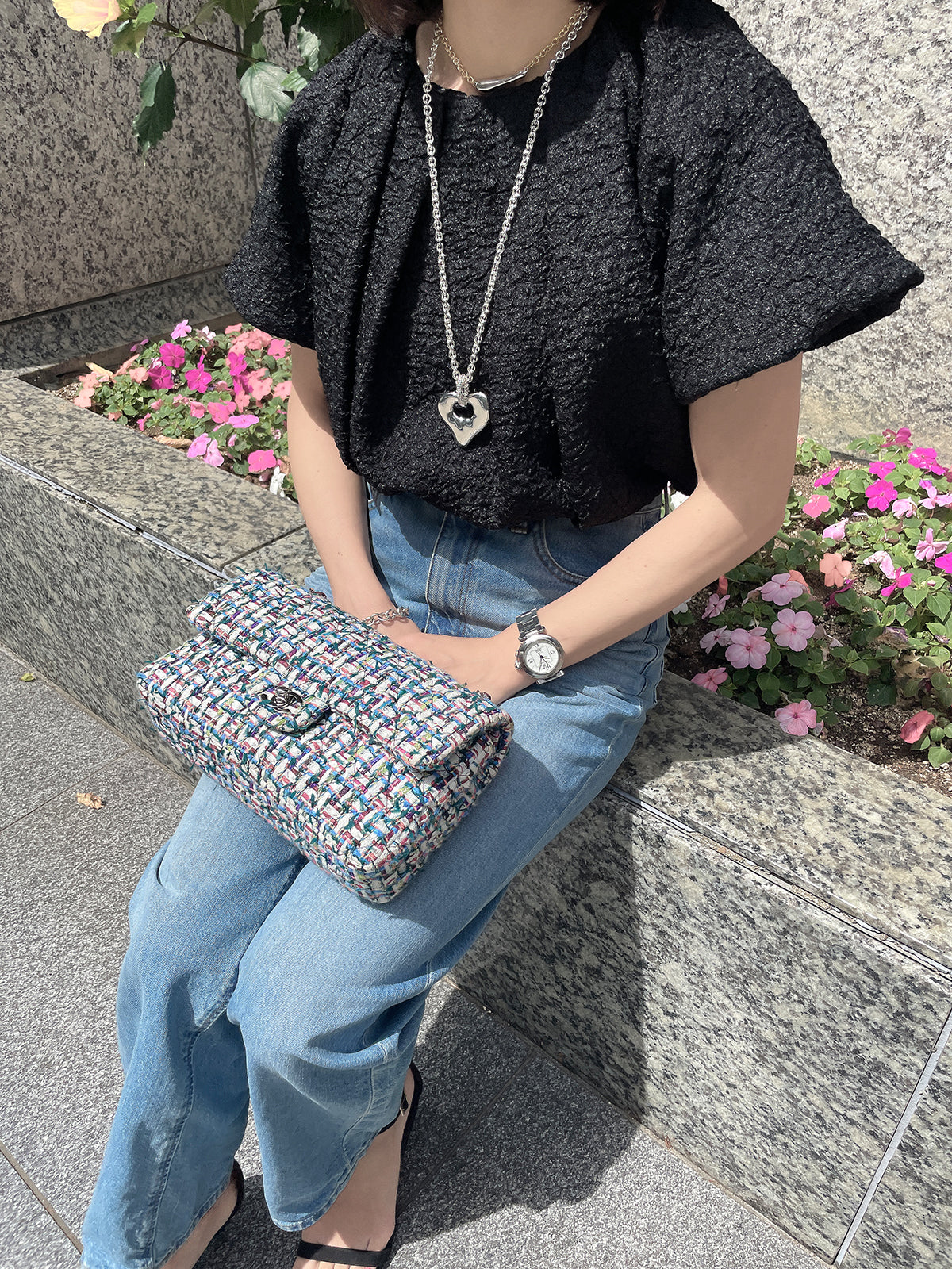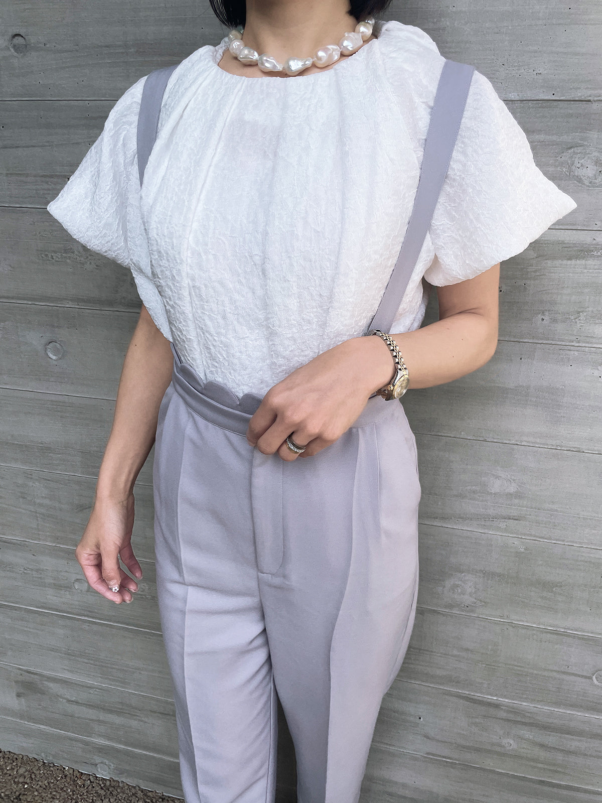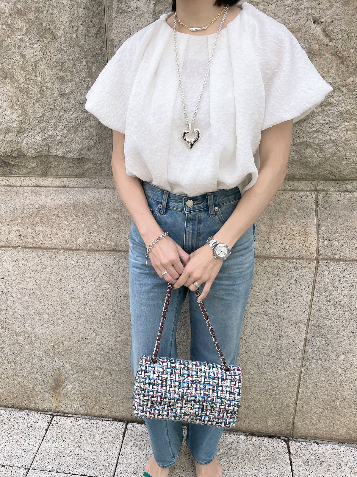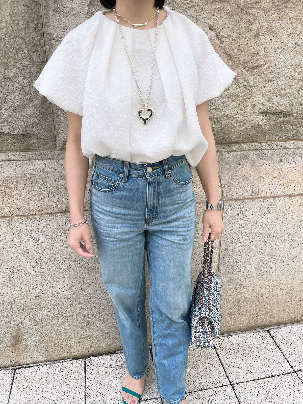 The sleeve length that falls slightly on the upper arms makes the arms look slender while giving a cool impression. It is a gorgeous blouse that can be worn with a wide range of scenes, such as with a casual bottom such as denim, as well as with a beautiful bottom, such as a meal or an occasion.