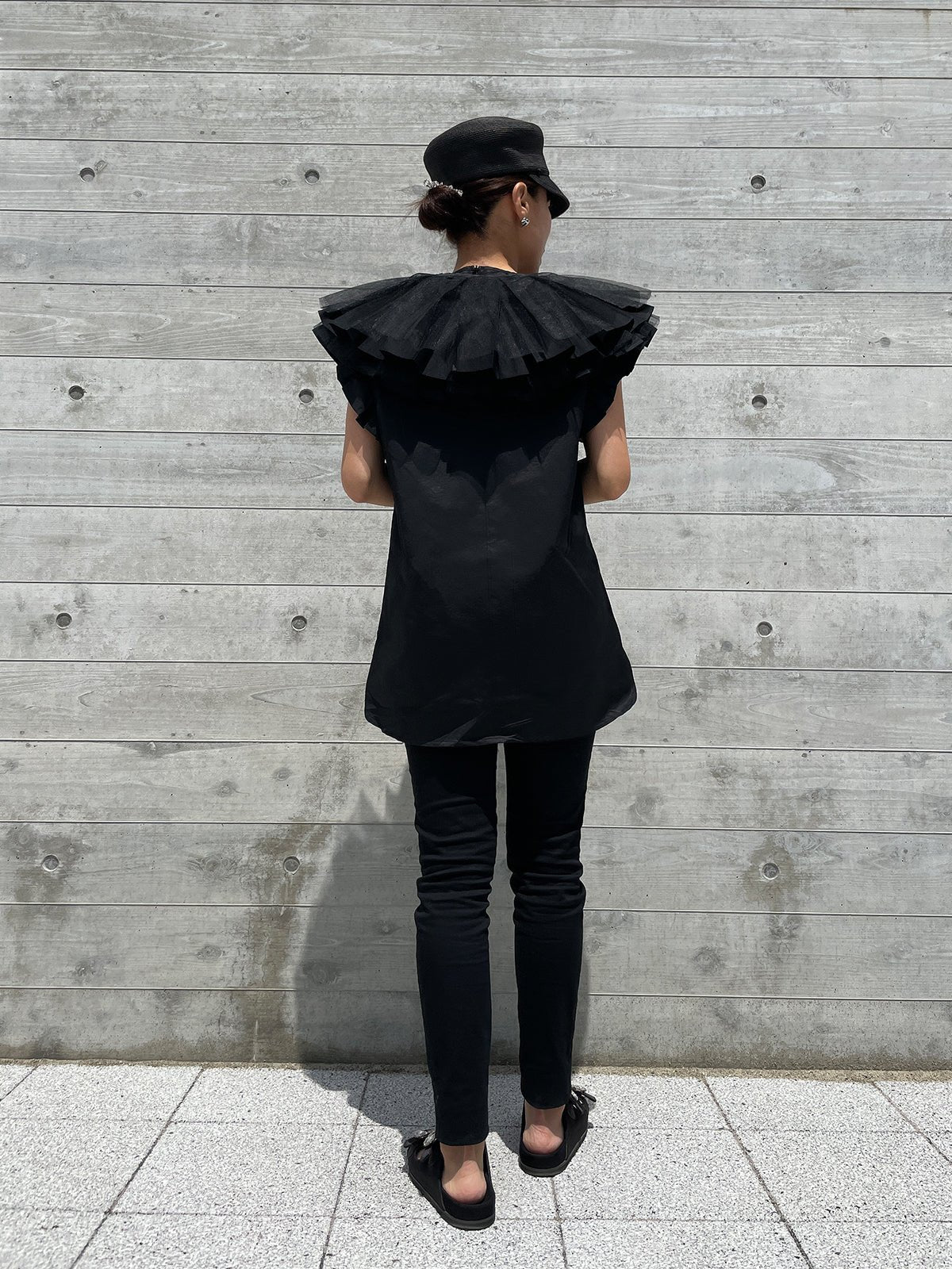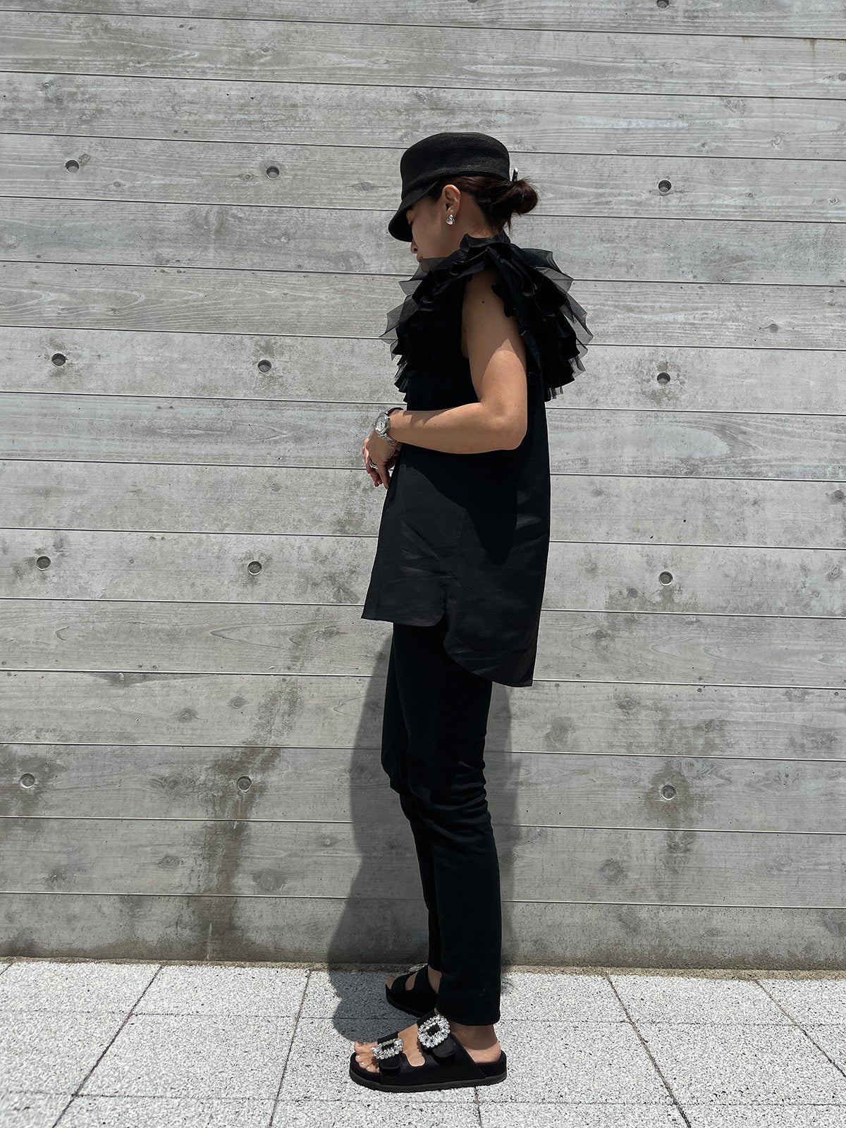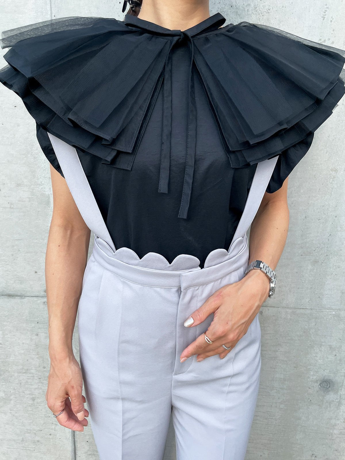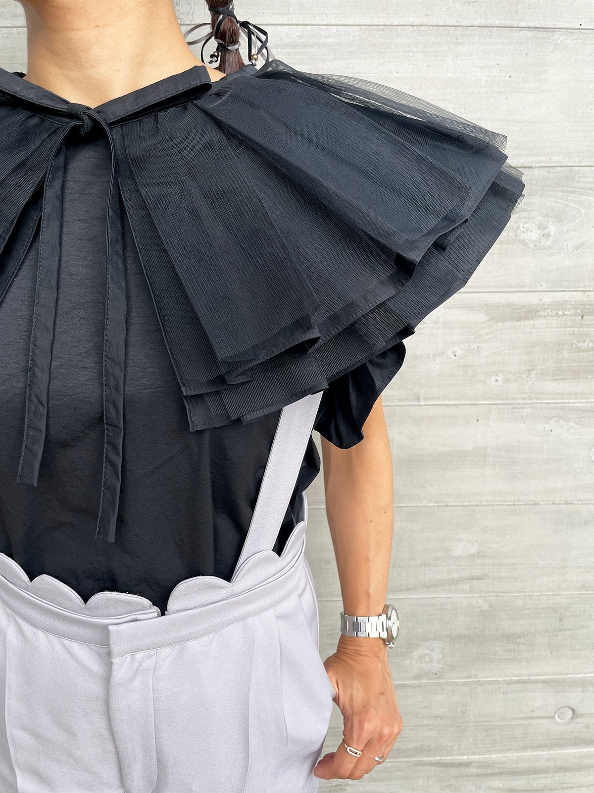 In addition, if you remove the collar, it gives a completely different impression as an additional piece, and the sleeves are also decorated with ruffles to make it look more glamorous when worn alone.The side slits are round, so the silhouette from the side is also distinctive, allowing for a wide range of styling options.