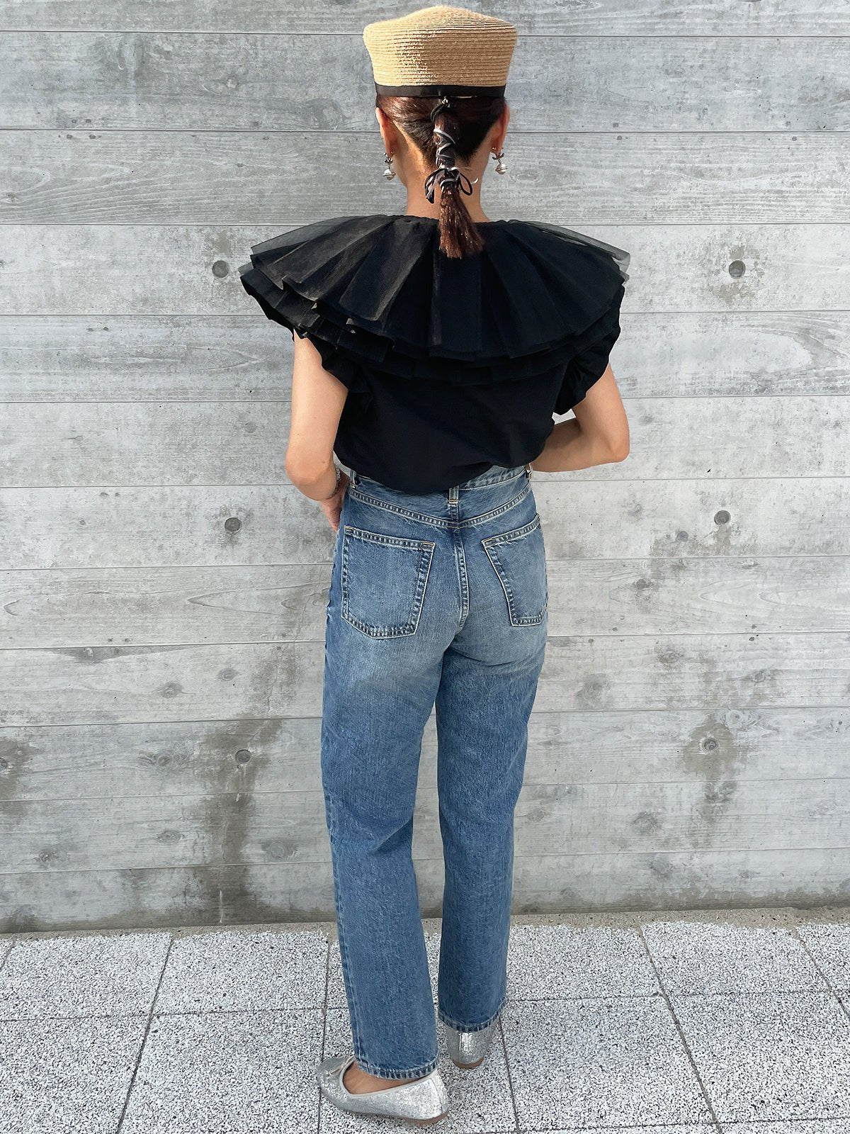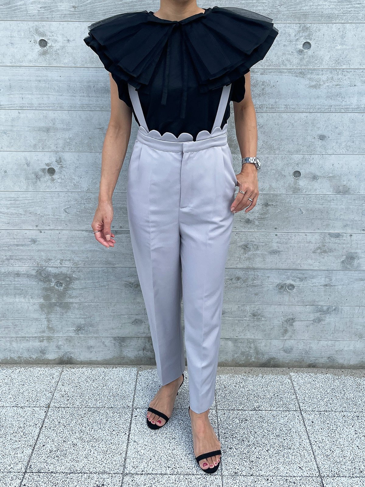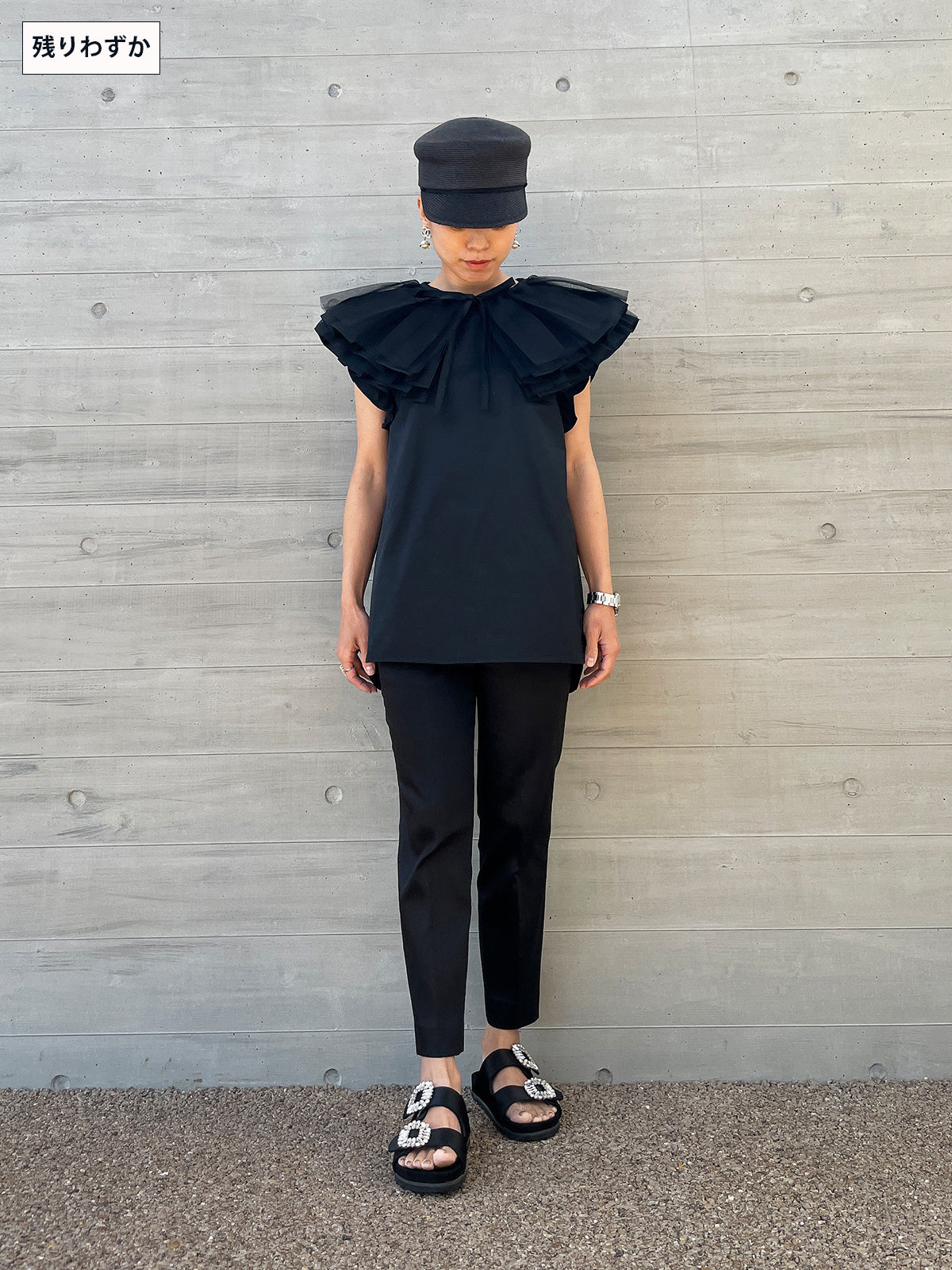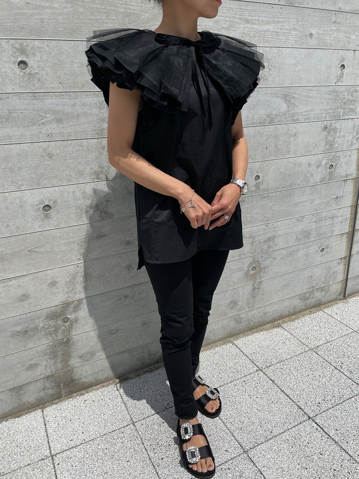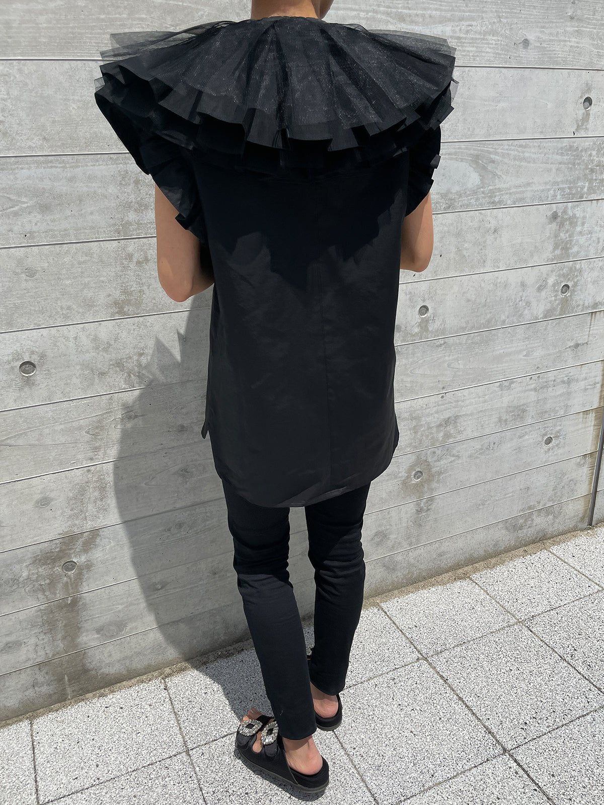 In addition, if you remove the collar, it gives a completely different impression as an additional piece, and the sleeves are also decorated with ruffles to make it look more glamorous when worn alone.The side slits are round, so the silhouette from the side is also distinctive, allowing for a wide range of styling options.