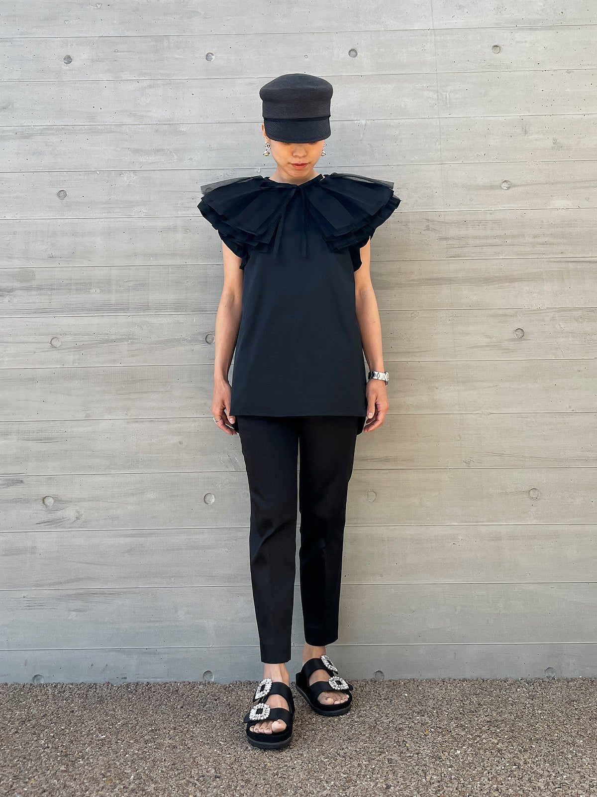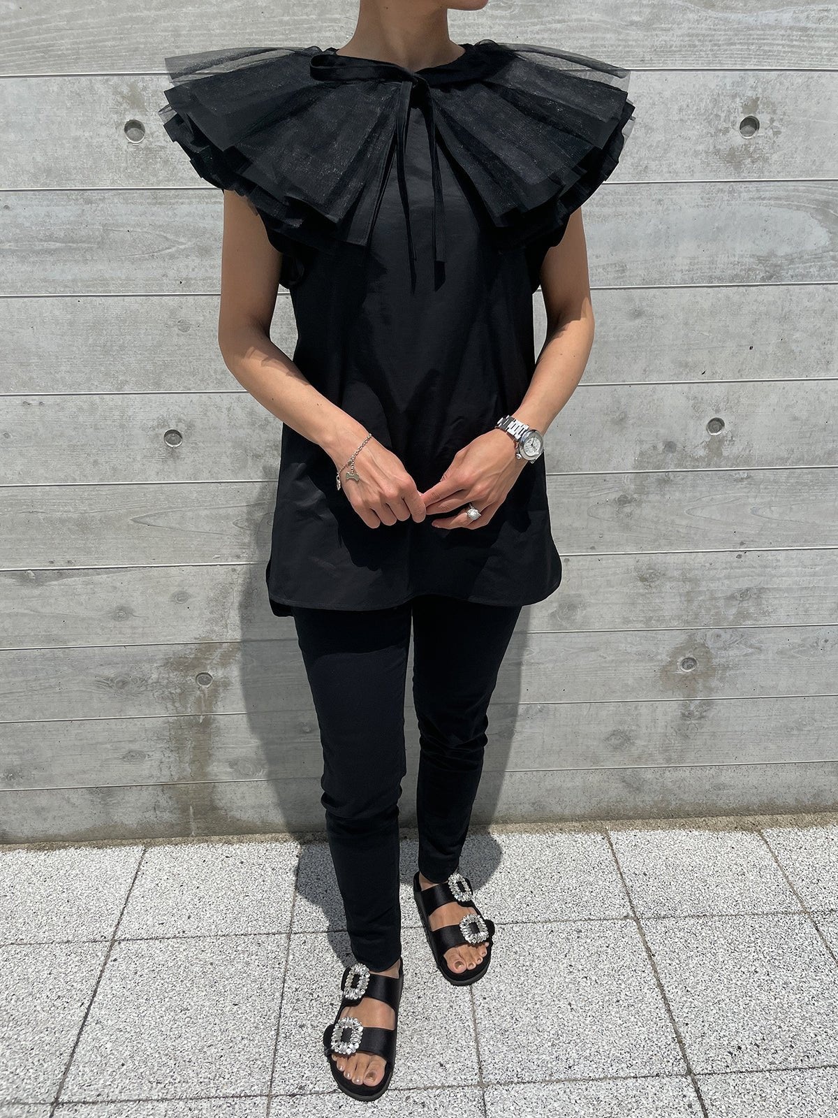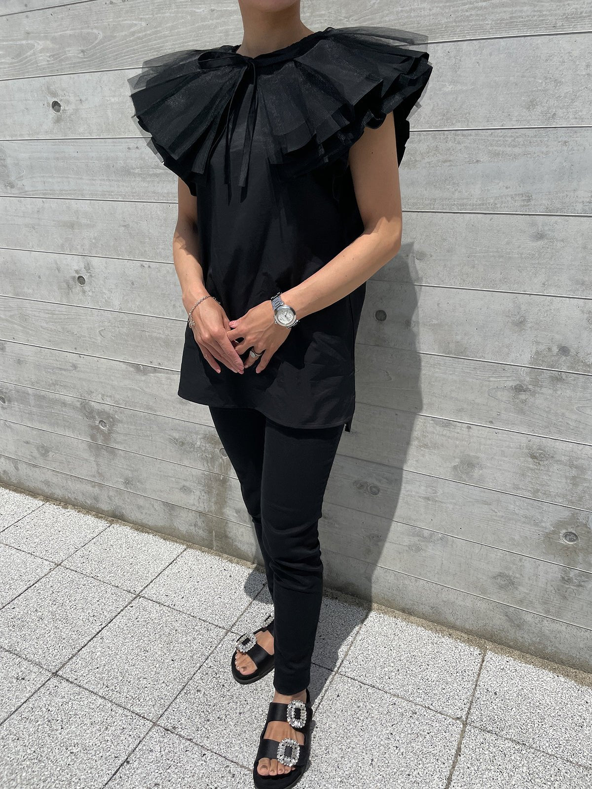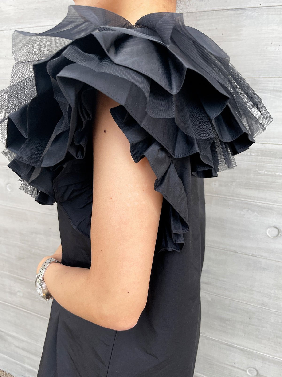The ruffled sleeves are designed to cover your upper arms and are bold and voluminous, so you can wear it while minimizing exposure.