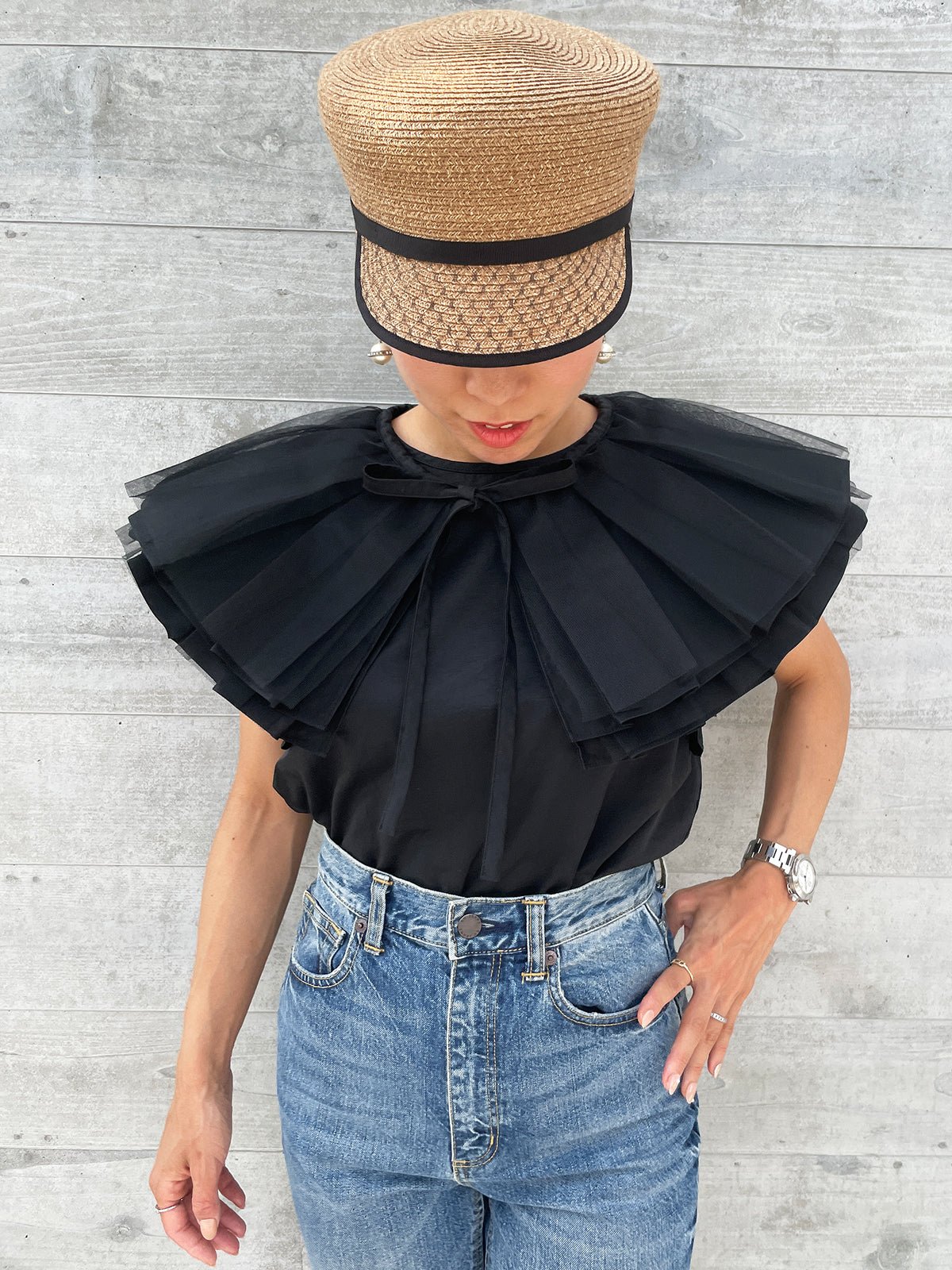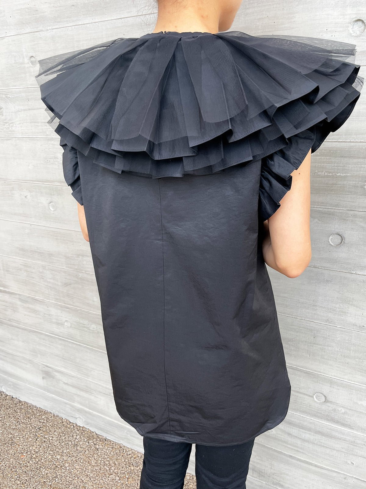 The "Kururi Blouse" features bold pleats and tulle