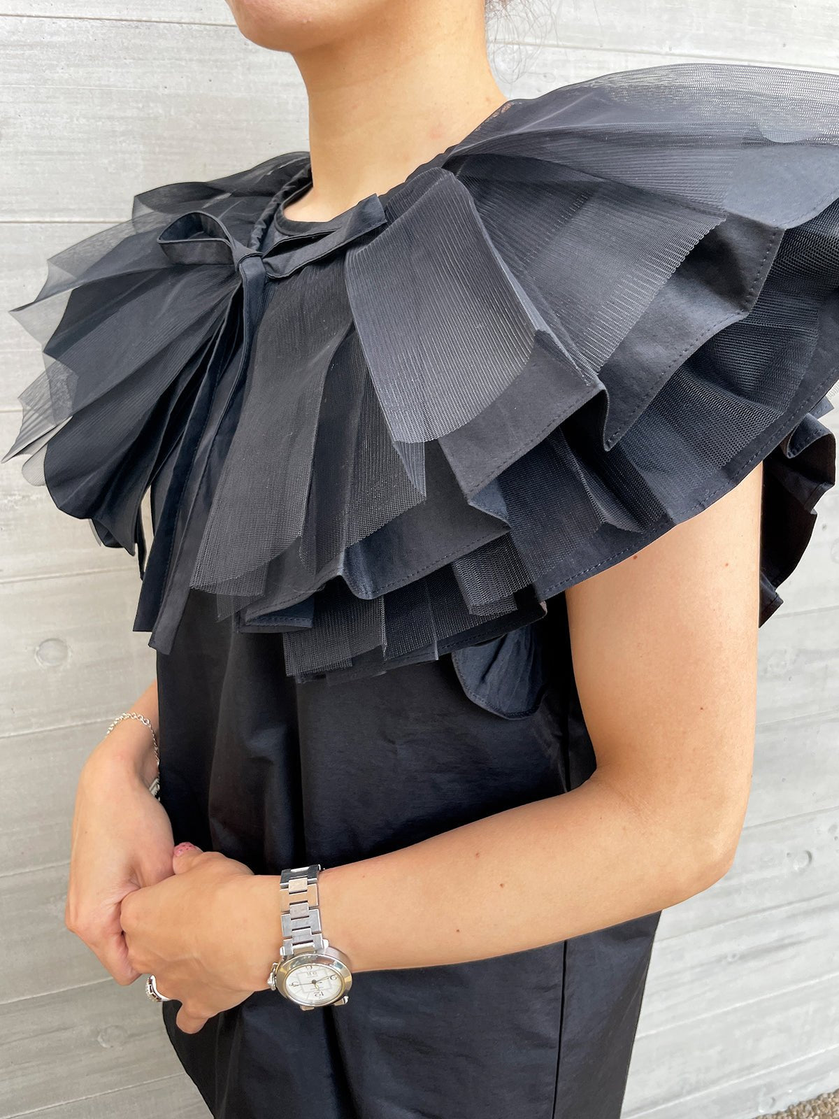 We wanted to create a design that could be tied in any position you like by twirling it around in 360 degrees, and for the collar which has four layers of pleats and tulle, we put the tulle at the front to give a sense of airiness to a collar that can often look heavy.