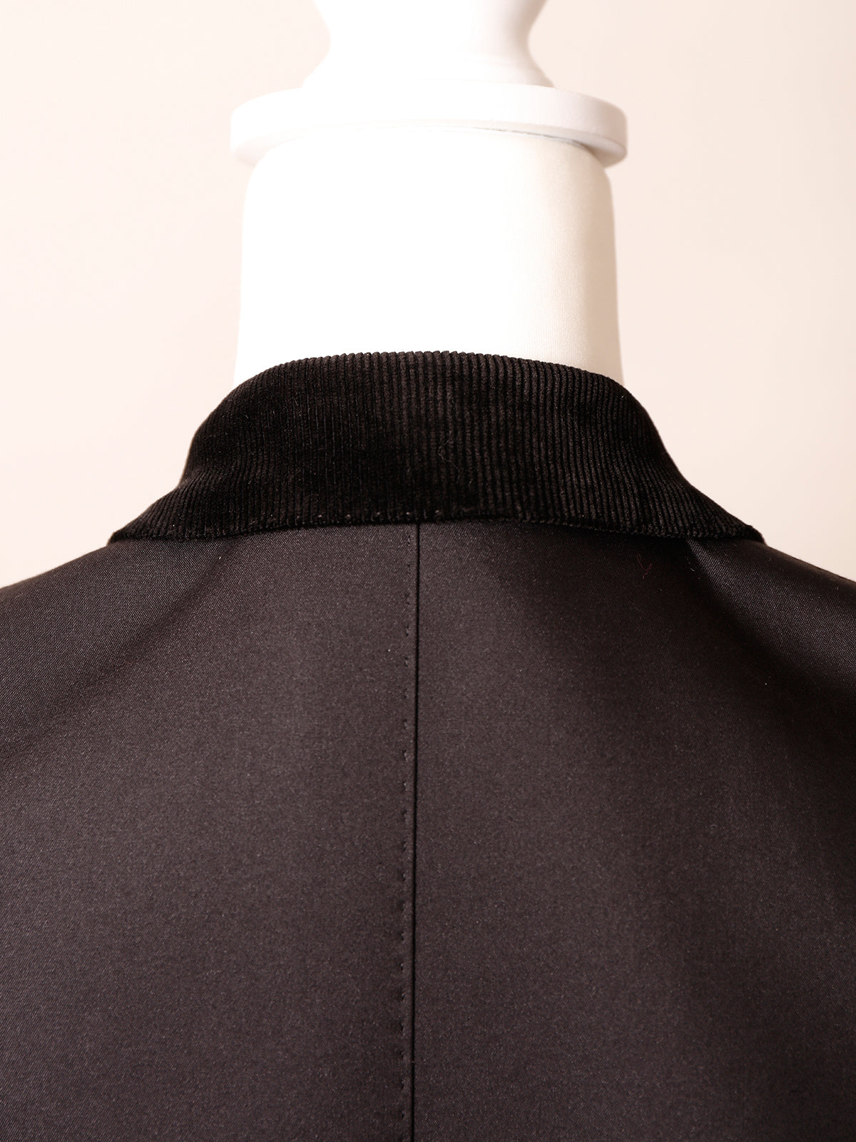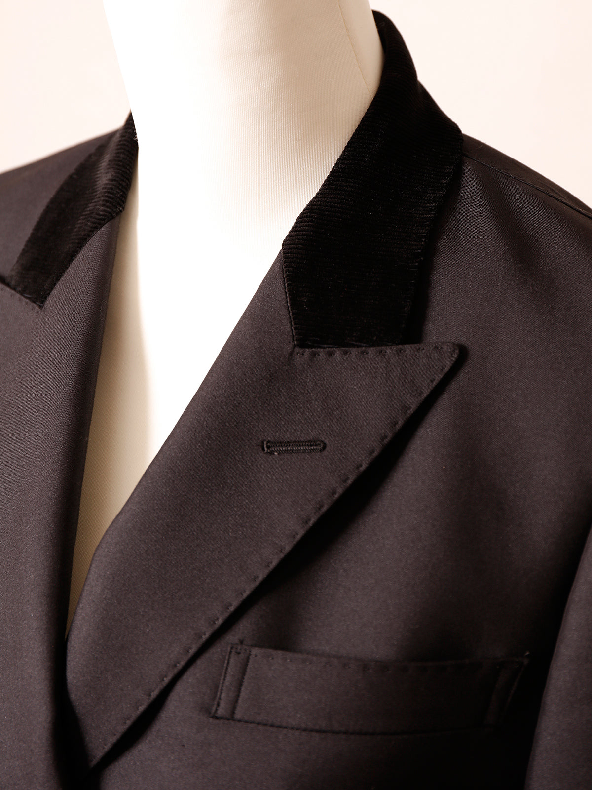 メンズのタキシードにも多く用いられるピークトラペルが、シャープで洗練された印象を演出。 上襟にはコーデュロイ素材を使用し、異素材のコントラストがさりげない奥行きを添えています。