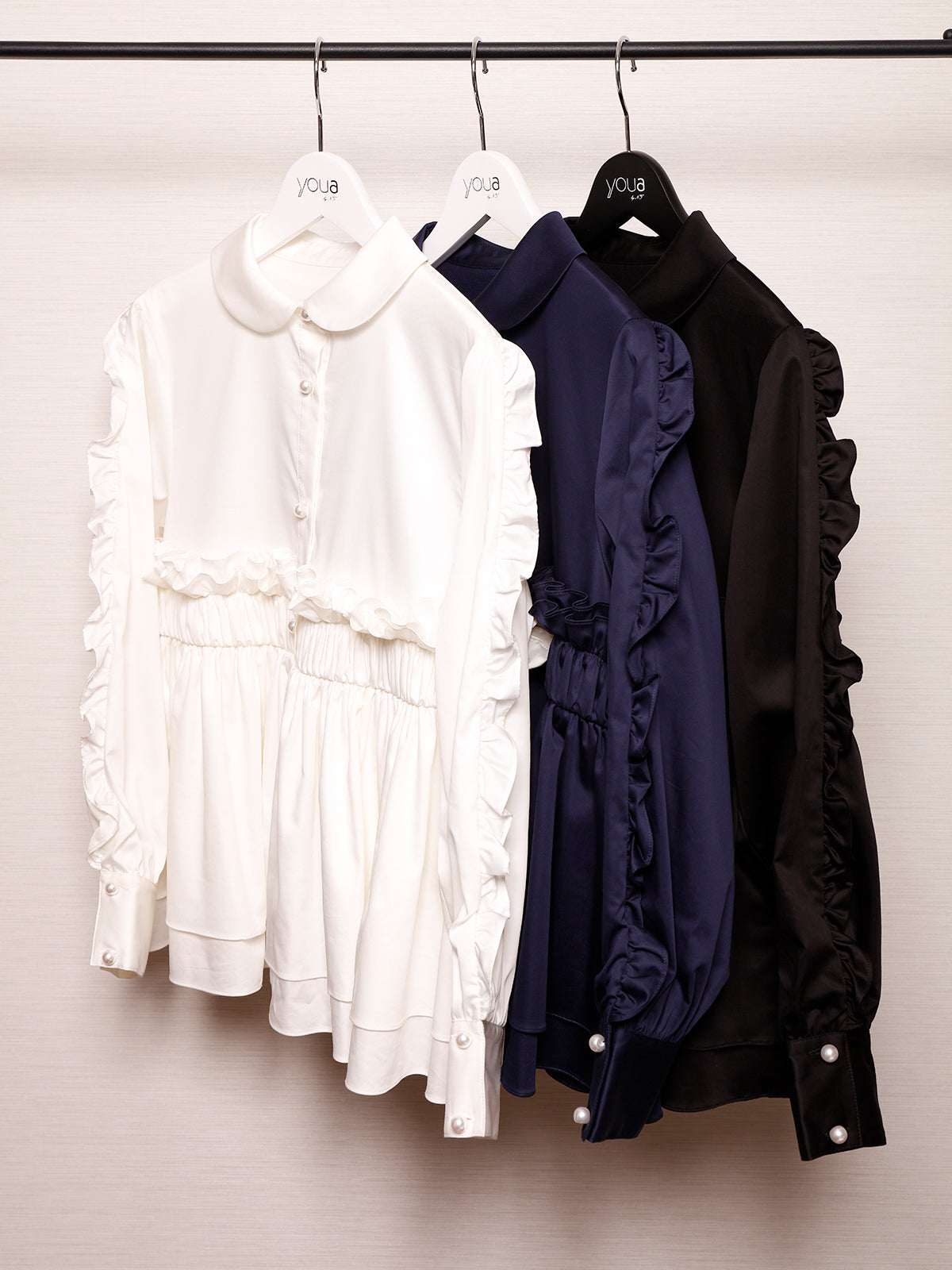 丸襟で大人可愛らしく、袖口と胸元はパールボタンでエレガントに、ウエストからフワっと広がるシルエットで、ワイドパンツにもベストマッチする着丈はyoua23AW推しブラウスの1Styleです。